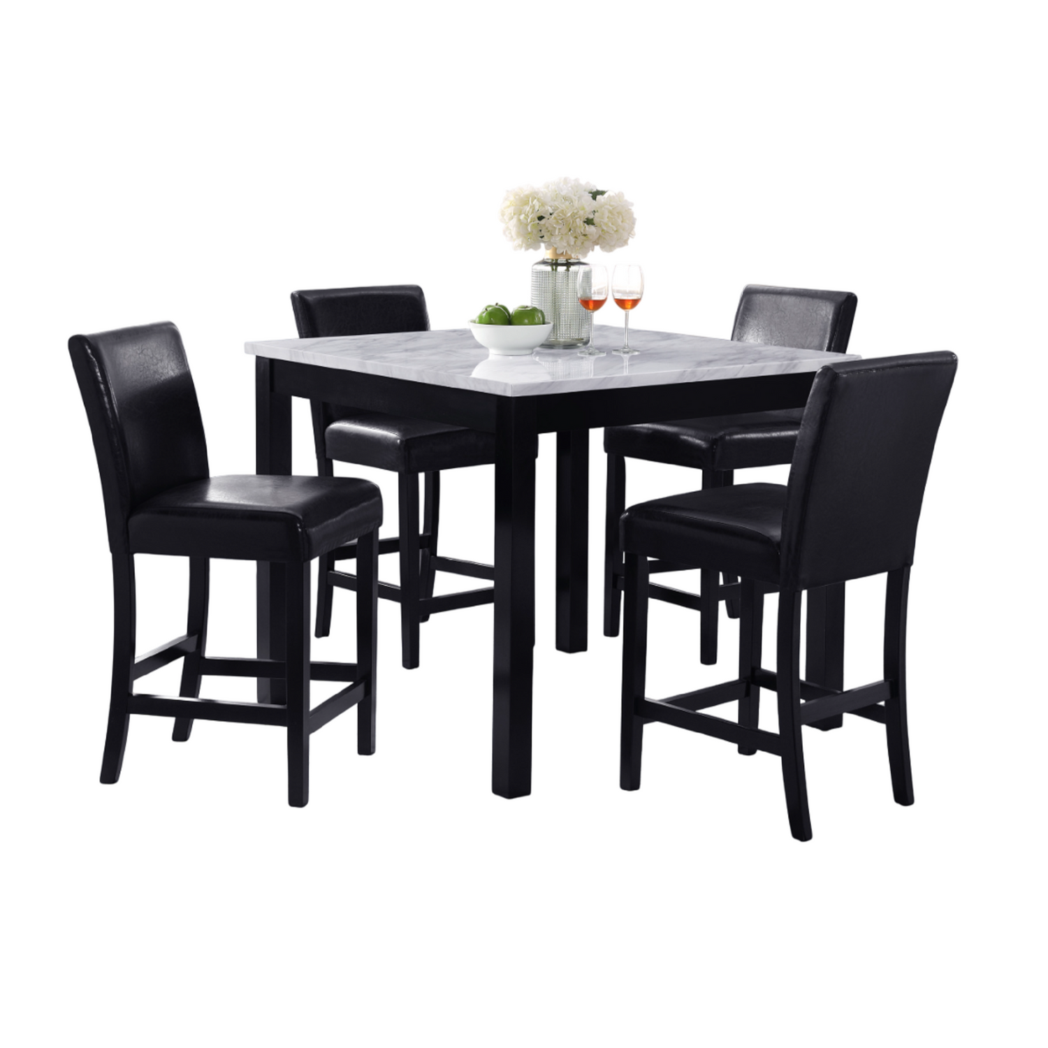 Contemporary 5pc Counter Height Dining Set with Square White Faux Marble Table and Black Faux Leather Upholstered Chairs