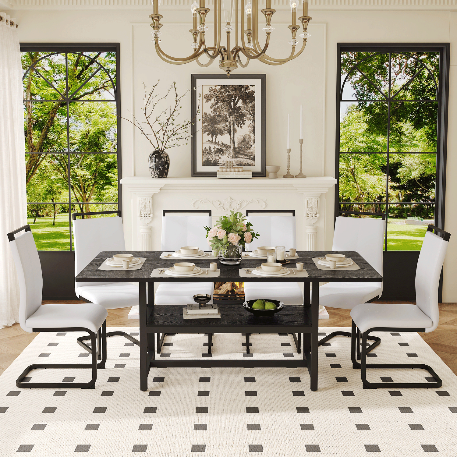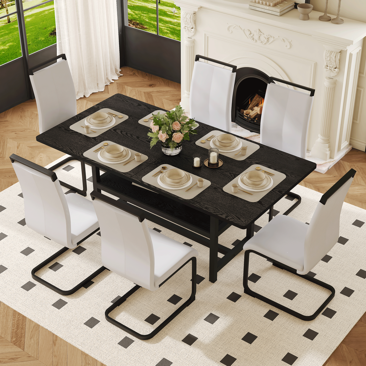 Table and chair set.71*35.4 inch Black Grain Spliced Dining Table With Storage Function In The Middle Of The Table Legs.Paired with 6 White PU Chairs With C-tube Black Metal Chair Legs.