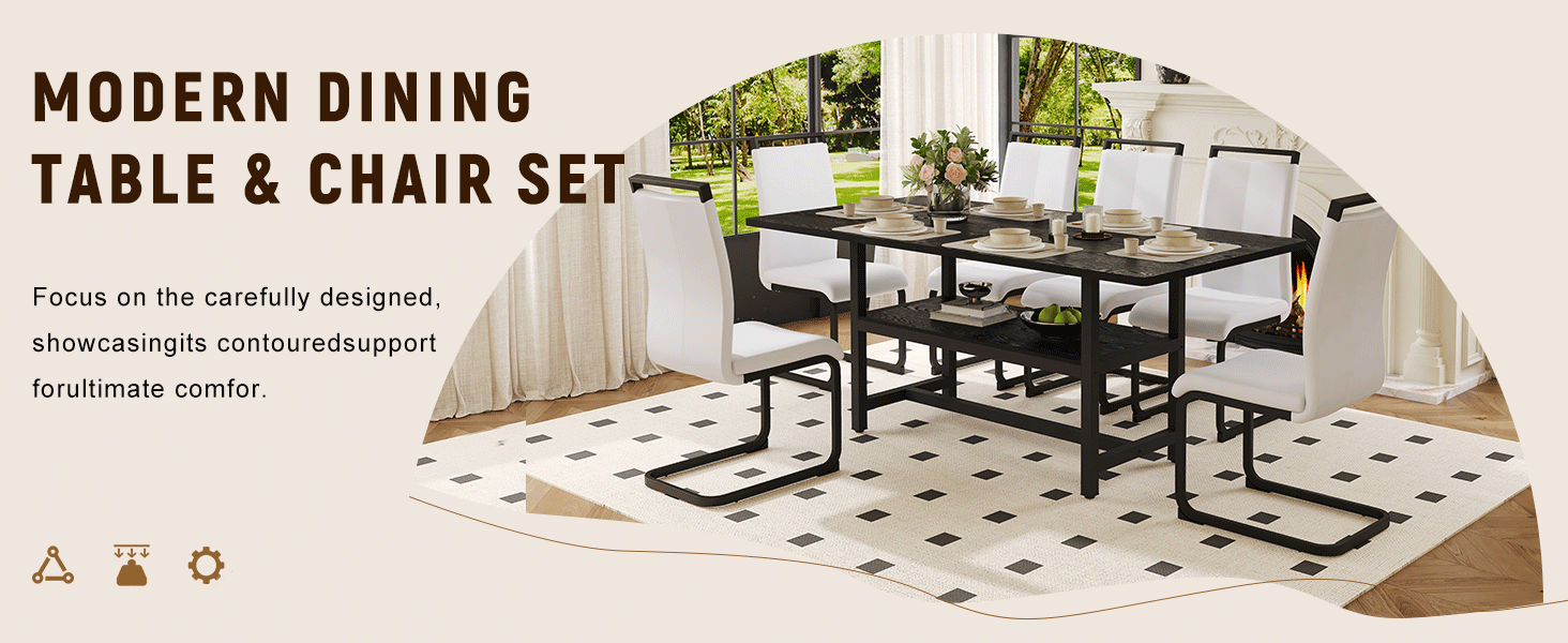 Table and chair set.71*35.4 inch Black Grain Spliced Dining Table With Storage Function In The Middle Of The Table Legs.Paired with 6 White PU Chairs With C-tube Black Metal Chair Legs. is available