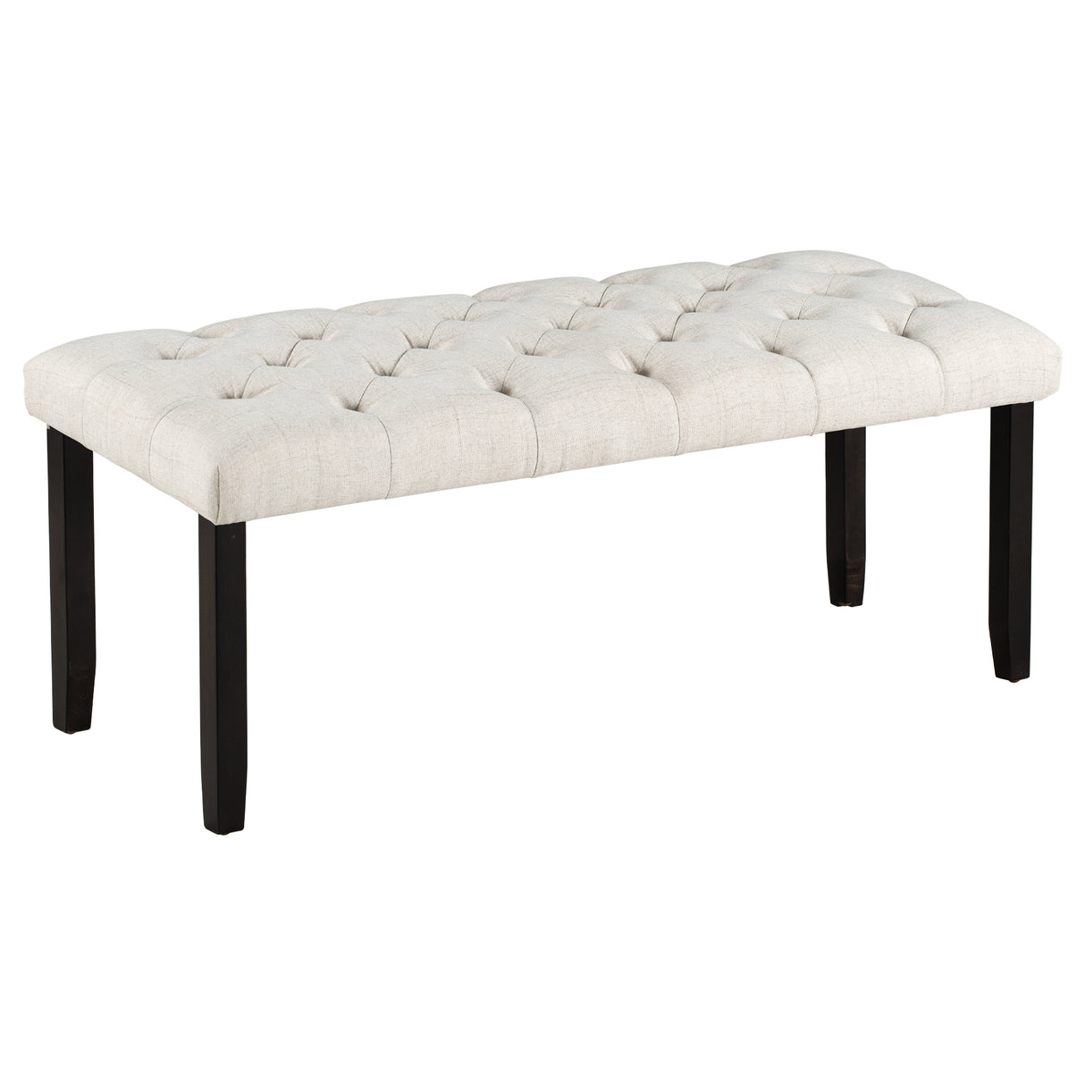 The chairs showcase high backs, linen upholstered seats, and button-tufting for a classic look. The chair's ergonomic curved back and 4.3" thickness soft cushion, matching a 48" length bench, provide a comfortable experience in daily usage. The load-bearing capacity of chair and bench are 250lbs.