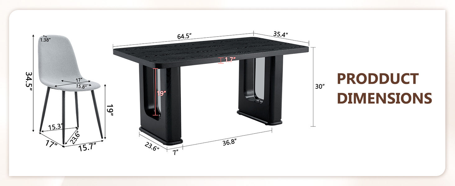 - Overall dimensions: The dining table is 64.5 inches long, 35.4 inches wide, and 30 inches high. The spacious tabletop can easily accommodate multiple people for dining, meeting the needs of family gatherings or friend gatherings.Exquisite desktop material: The desktop is made of MDF material with realistic texture stickers, presenting a natural and warm texture. It is 1.7 inches thick, sturdy, durable, and easy to clean.