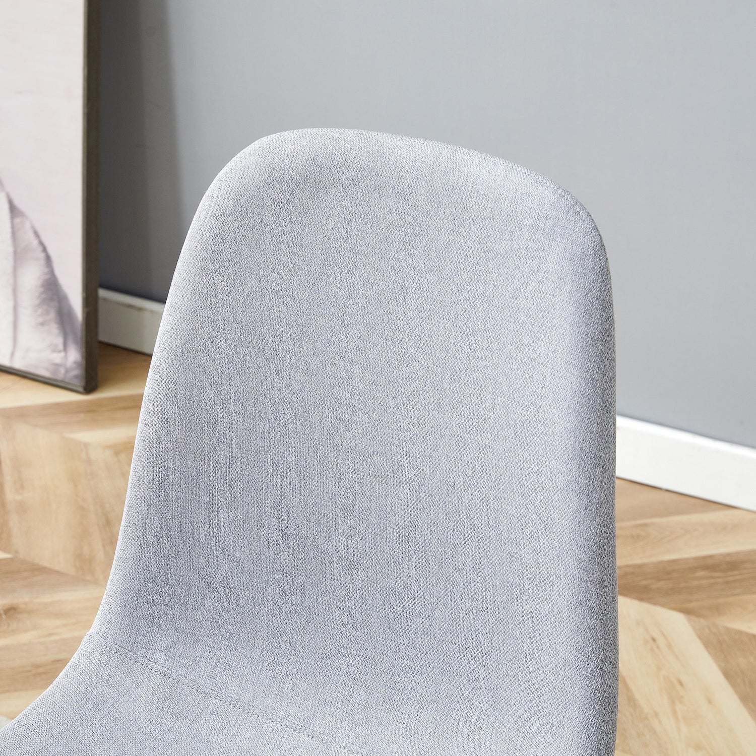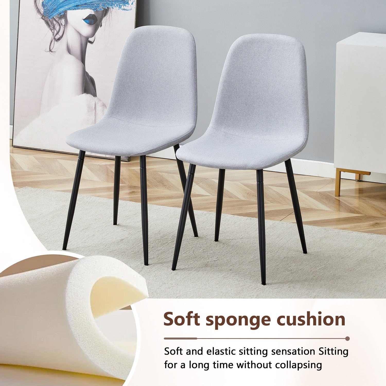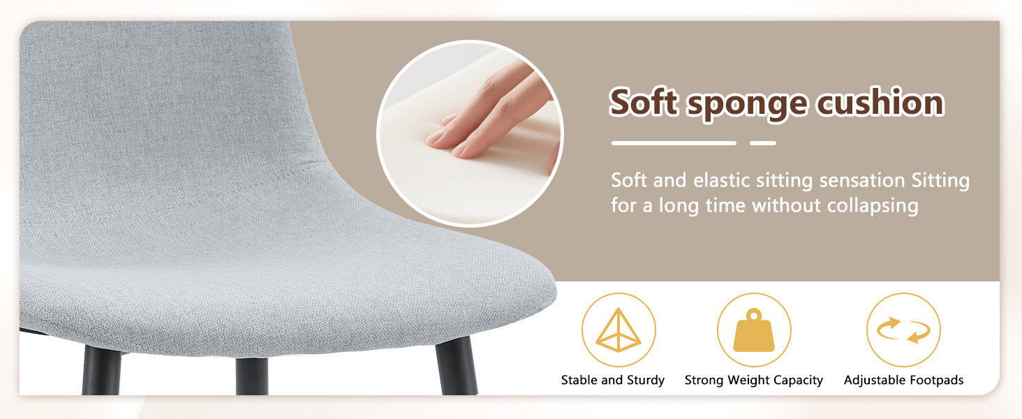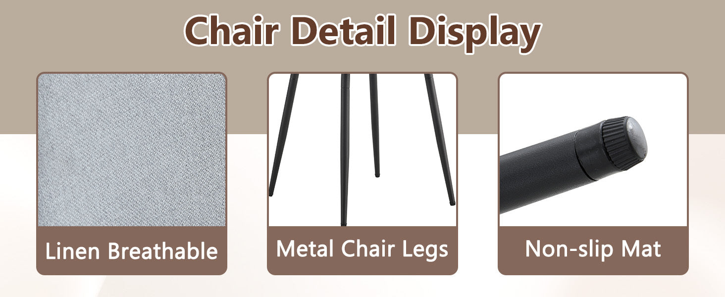 - Linen-Cotton Material: The chairs are made of light gray linen-cotton, naturally breathable, offering excellent comfort.Easy to Clean: The linen-cotton material is easy to clean and maintain, keeping the chairs fresh and new.