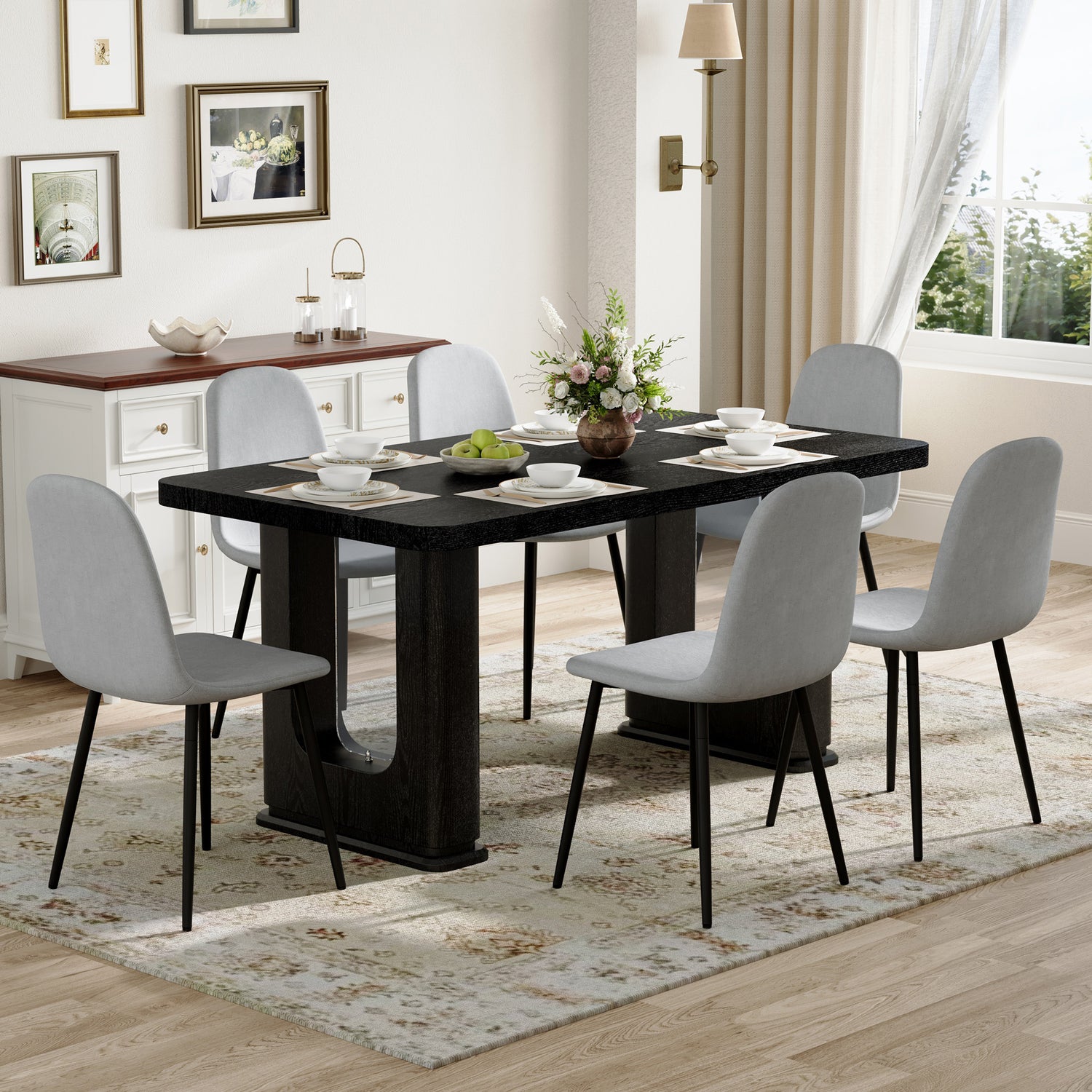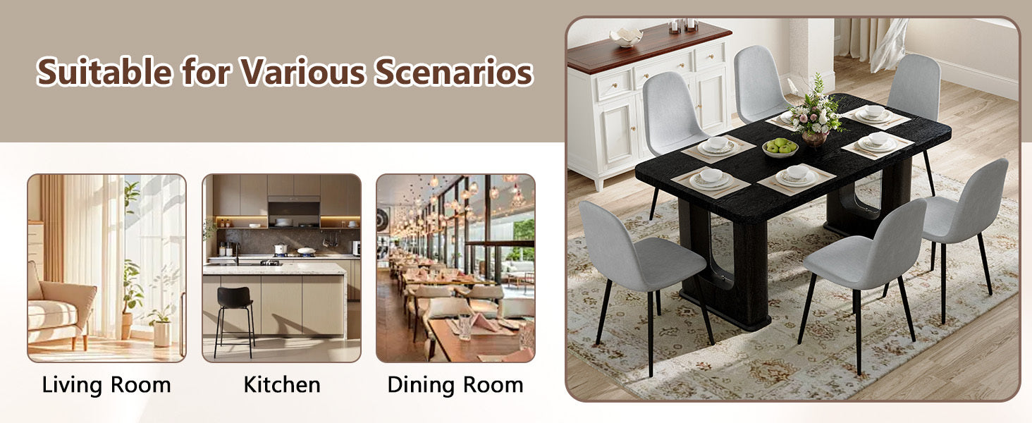 Table and chair set.64.5 x 35.4 Inch Stylish Black Wood Color Textured Dining Table.Paired with 6 Light Gray Linen-Cotton Material High Resilience Dining Chair with Metal Leg.