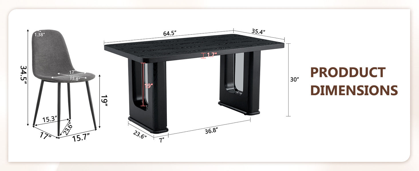 - Overall dimensions: The dining table is 64.5 inches long, 35.4 inches wide, and 30 inches high. The spacious tabletop can easily accommodate multiple people for dining, meeting the needs of family gatherings or friend gatherings.Exquisite desktop material: The desktop is made of MDF material with realistic texture stickers, presenting a natural and warm texture. It is 1.7 inches thick, sturdy, durable, and easy to clean.