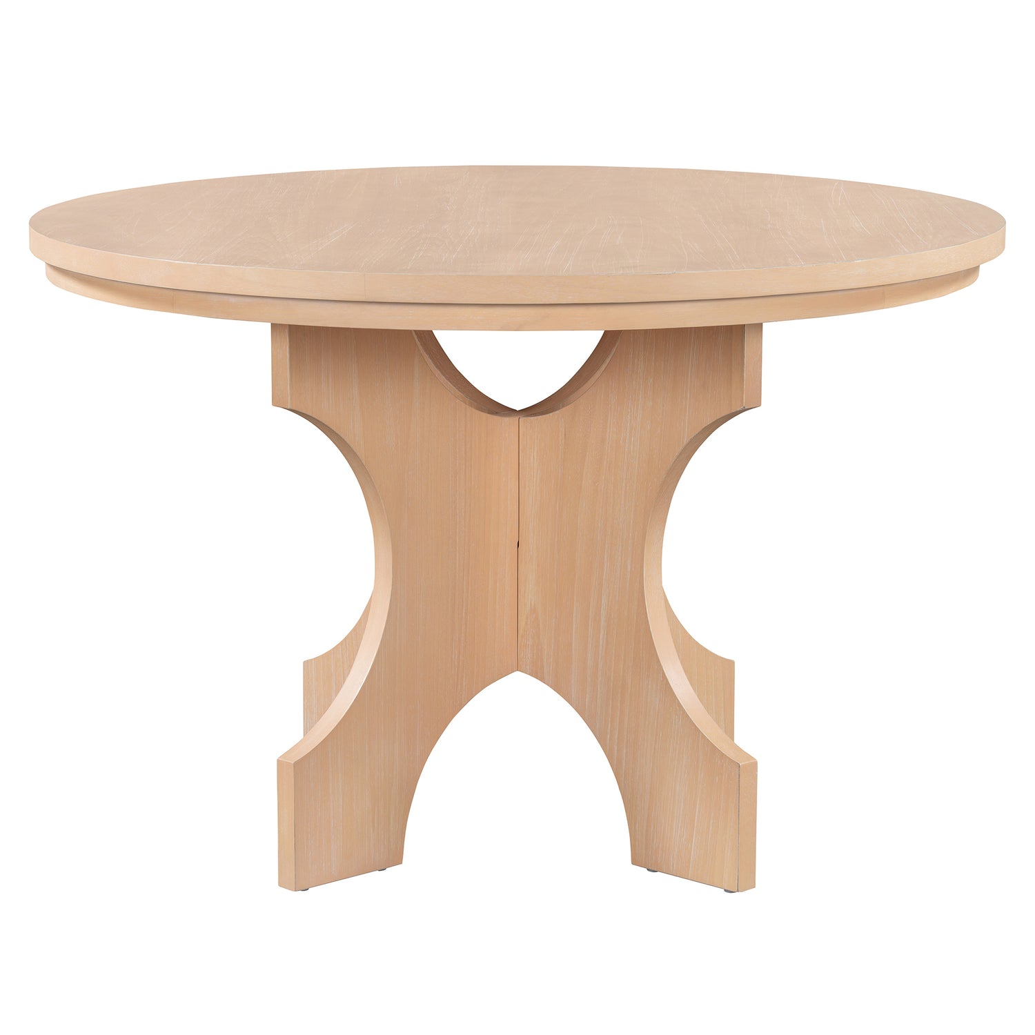 This round dining set combines modern design with rustic charm. The smooth, curved table base adds a striking focal point, while wood finish brings warmth to your space. Slat-back chairs and a gracefully arched bench, both with soft upholstered seats, complement the table's minimalist style. This versatile dining set is ideal for a variety of spaces, whether placed in a cozy kitchen, living room and dining room. Its clean lines and warm tones create a welcoming atmosphere