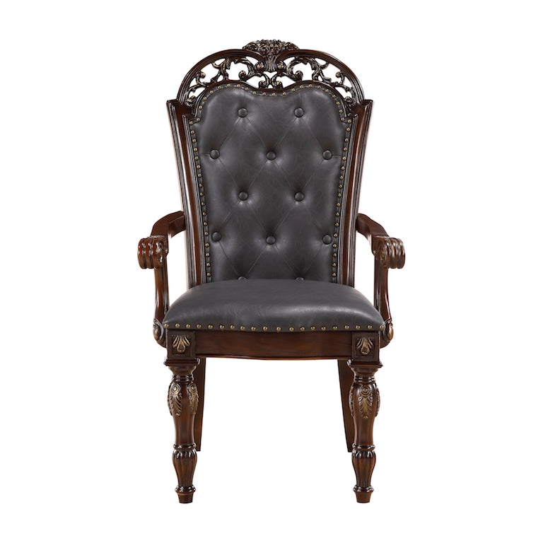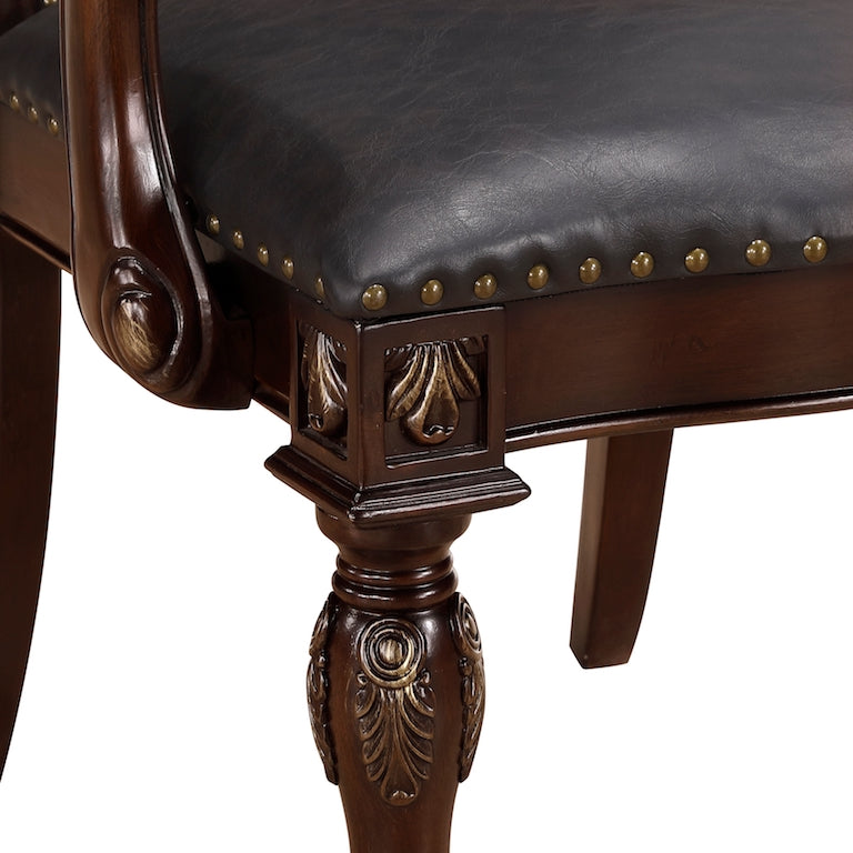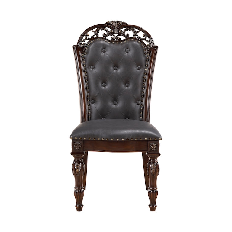 AI-Overview: The Homelegance Adelina Traditional Dining Room Collection captures the grandeur of Old-World craftsmanship, blending rich cherry wood tones with intricate carvings, gold tipping, and exquisite faux leather upholstery. Designed for those who appreciate timeless elegance, this set includes an extendable double pedestal table, button-tufted arm and side chairs, and optional buffet and hutch pieces featuring LED-lit display shelving. Every detail — from the acanthus leaf carvings to the nailhead trim — evokes sophistication and refined luxury, making the Adelina Collection a centerpiece for formal dining spaces.
