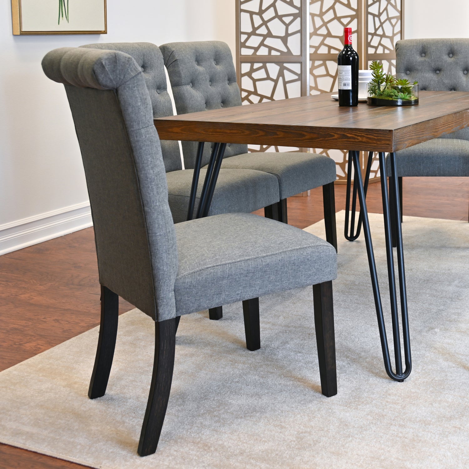 - HIGHLIGHTS: The dining table features a metallic hairpin design, which adds both stability and style. It has a rustic dark pine finish and showcases a natural wood grain texture, offering an elegant look. The chairs are designed with button-tufted details, providing a touch of sophistication. Chair legs are finished in a dark espresso color that complements the table perfectly. Indulge in the allure of this exquisite dining set and elevate your home decor.