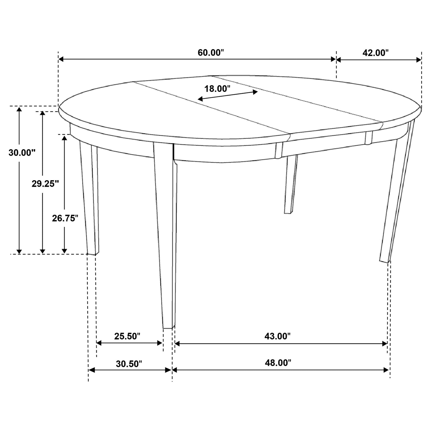- Oval dining table includes an 18-inch extension leaf, providing flexible seating options for larger gatherings