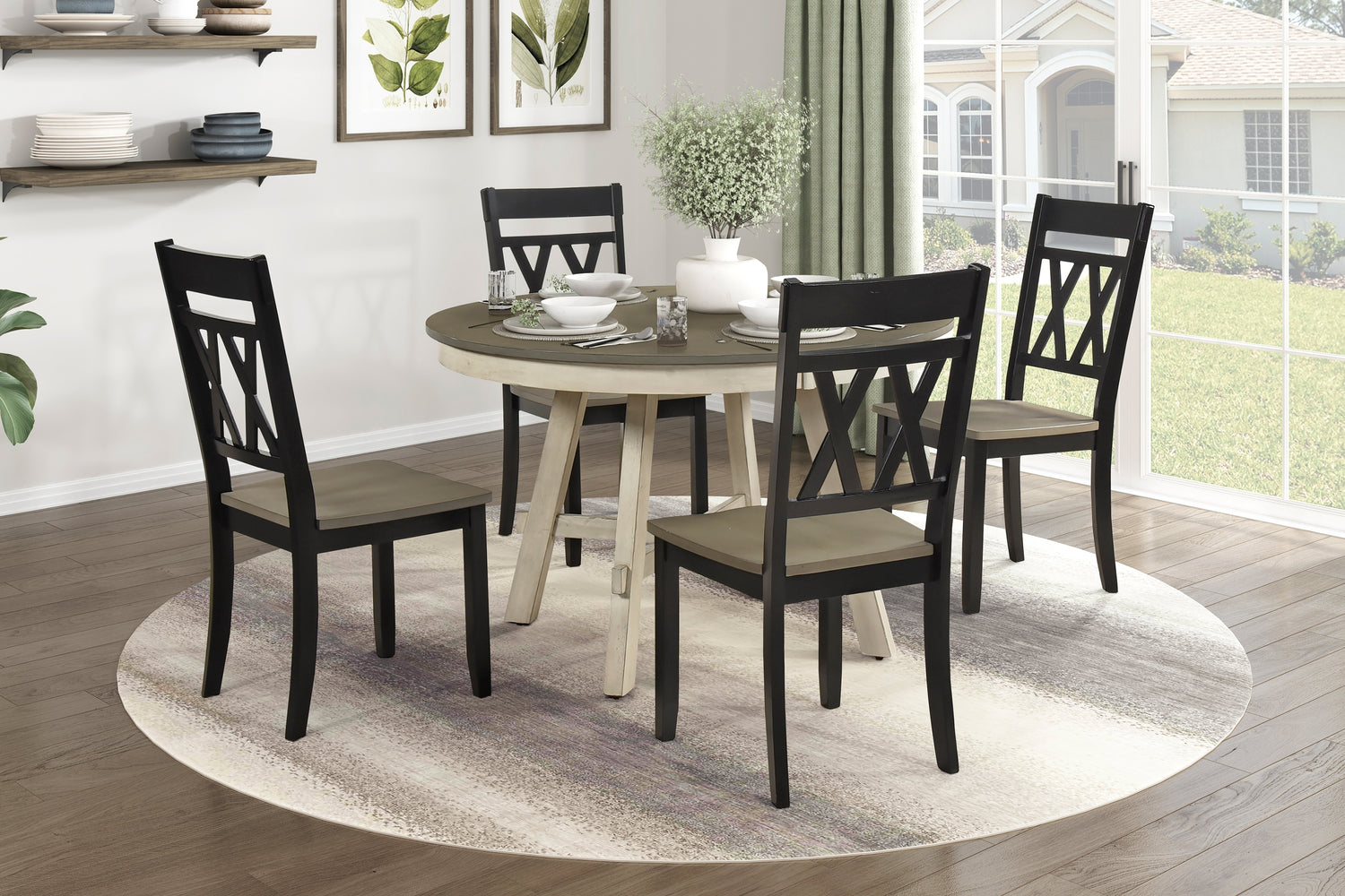 Contemporary Farmhouse Style Round Dining 5Pcs Set Table and 4x Side Chairs Wooden Furniture Antique White Gray Black Finish