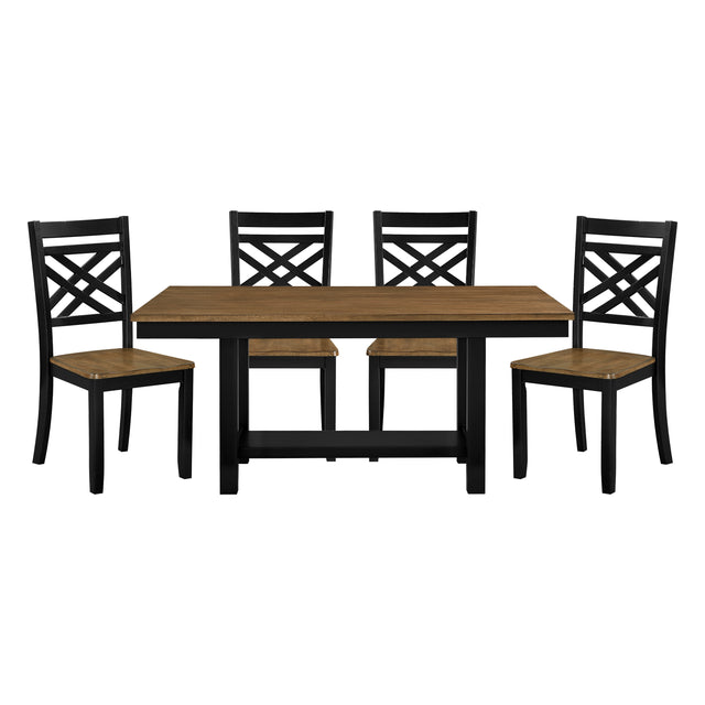 2-Tone Black Brown Finish 5pc Dining Set Table with Storage Shelf and 4x Side Chairs Modern Farmhouse Wooden Furniture