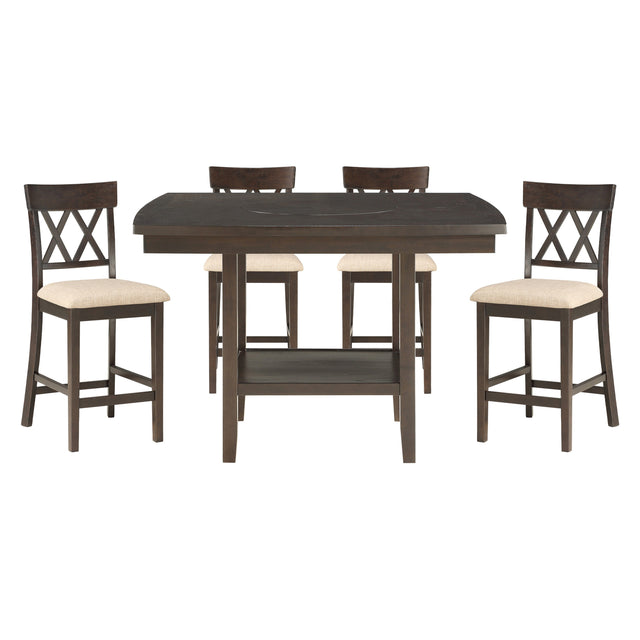 Dark Brown Finish Counter Height Table with Lazy Susan Lower Display Shelf and 4x Counter Height Chairs Contemporary Dining 5pc Set Wooden Furniture