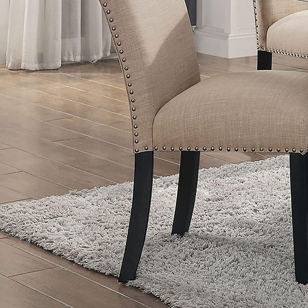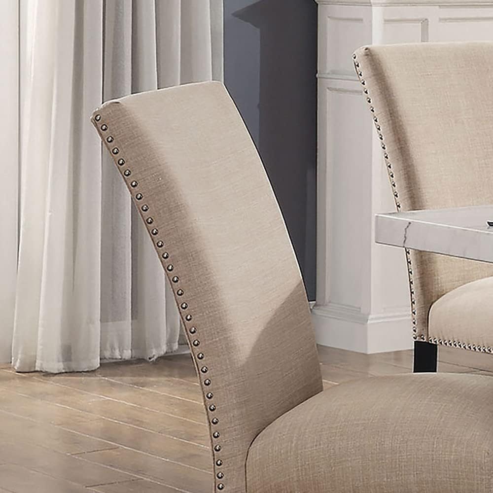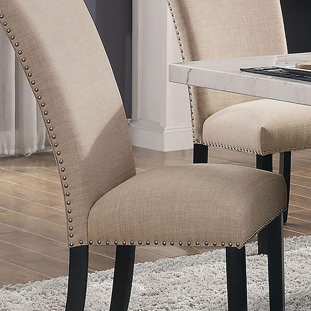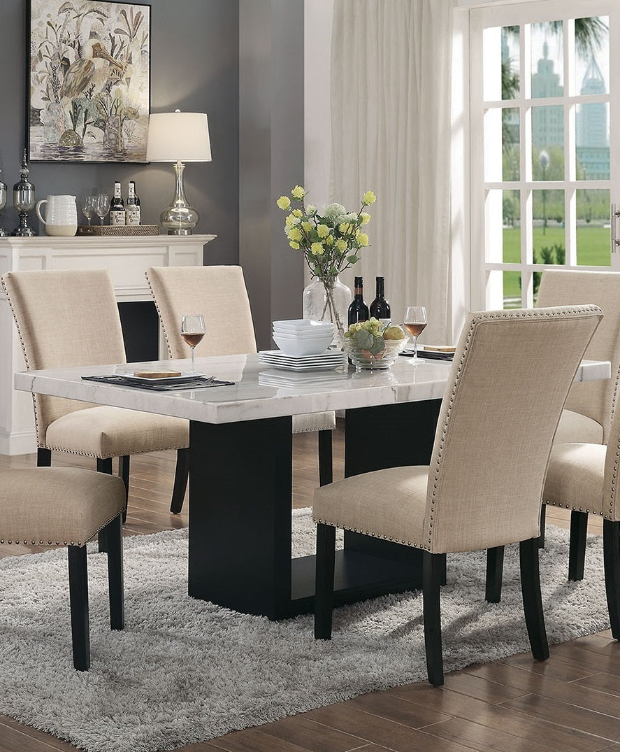 Gorgeous Marble Top Table w 6x Side Chairs Beige Fabric Upholstered Chair Dining Room 7pc Set Black Wooden Furniture