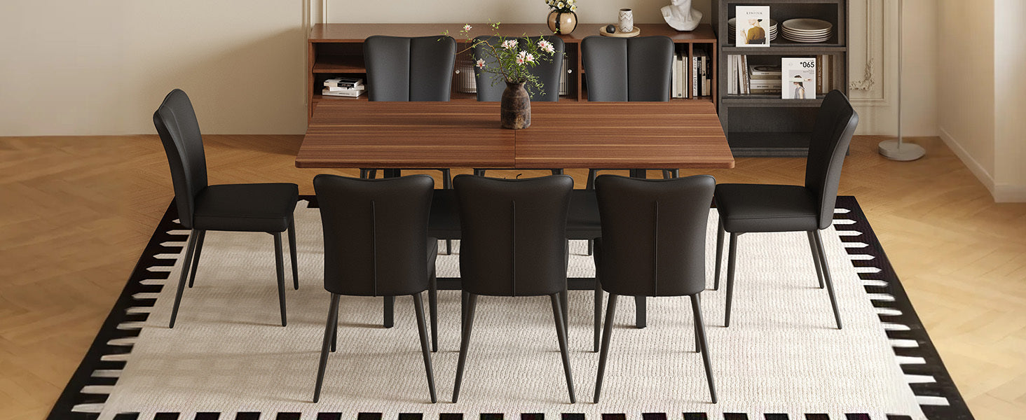 - PU Material for Comfort: The black chairs are made of PU material, with a vertical line design on the backrest that adds aesthetic detail while offering a soft and comfortable seating experience.