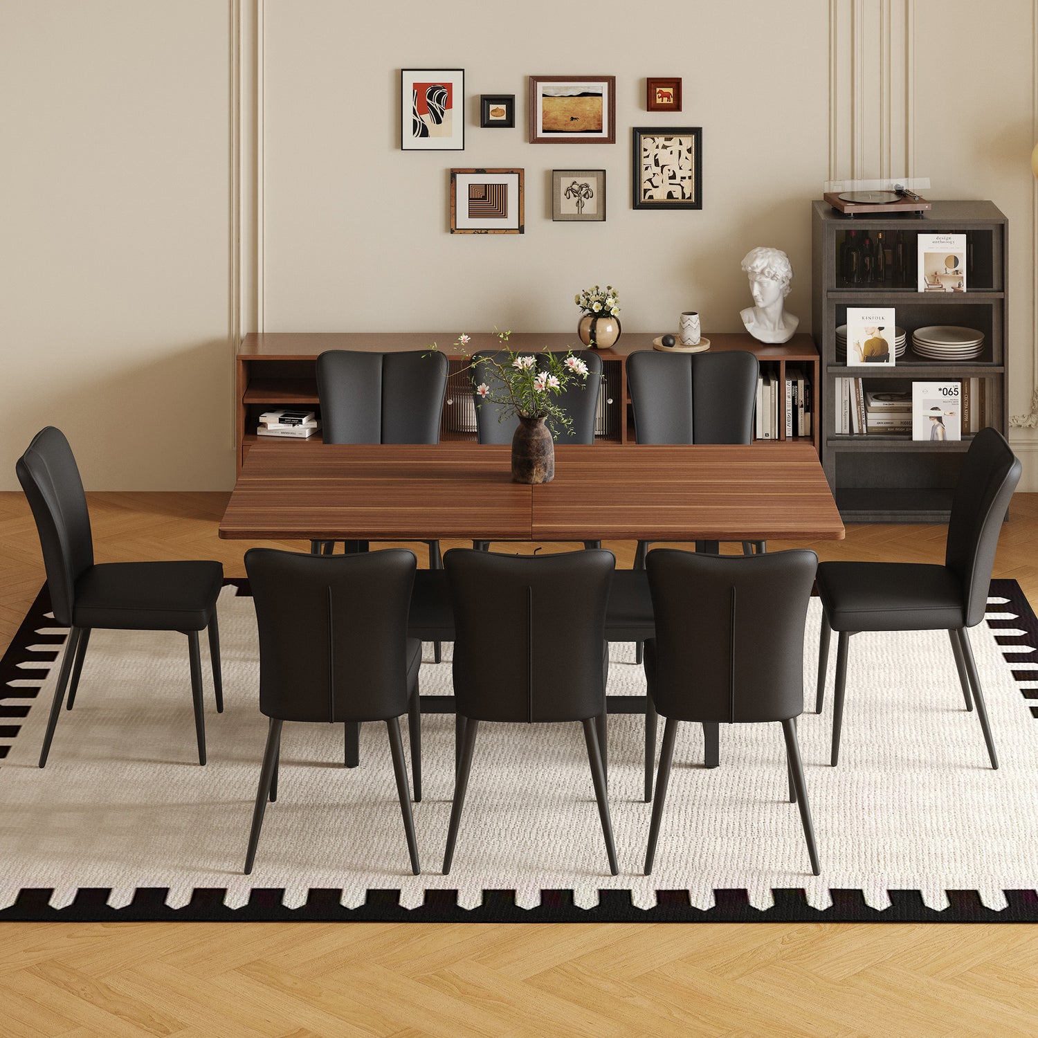 Table and chair set.71 inch long fashionable walnut grain dining table, a practical choice to add color to the home.Paired with 8 Black PU chairs with a vertical stripe design on the backrest.