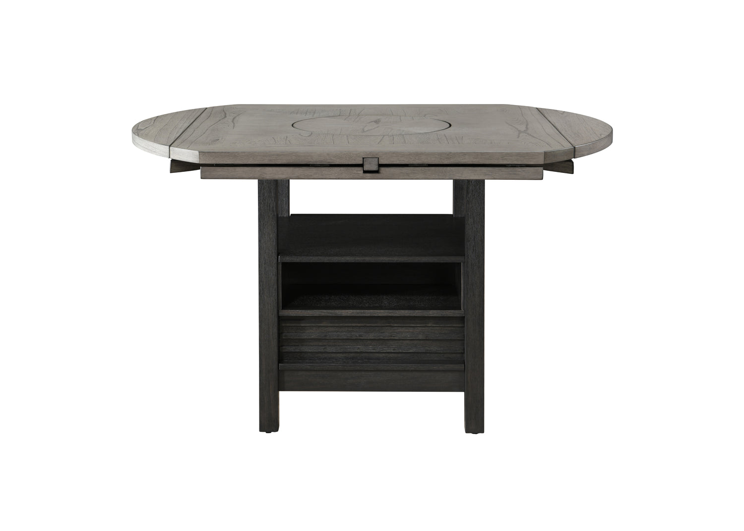5pc Farmhouse Contemporary Counter Height Dining Set Storage Table Single Pedestal Round Black Gray Natural Grain Integrated Turntable Drop Leaves Built-in Shelving Fabric Upholstery Chairs