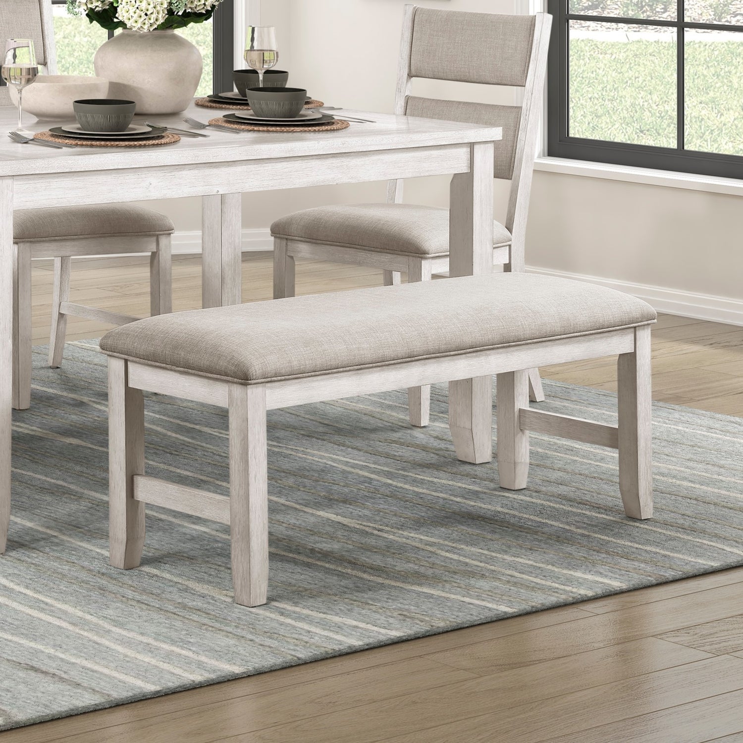 Modern Farmhouse 6pc Dining Set Table Bench 4x Side Chairs Upholstered Seat Antique White Finish Durable Wooden Furniture