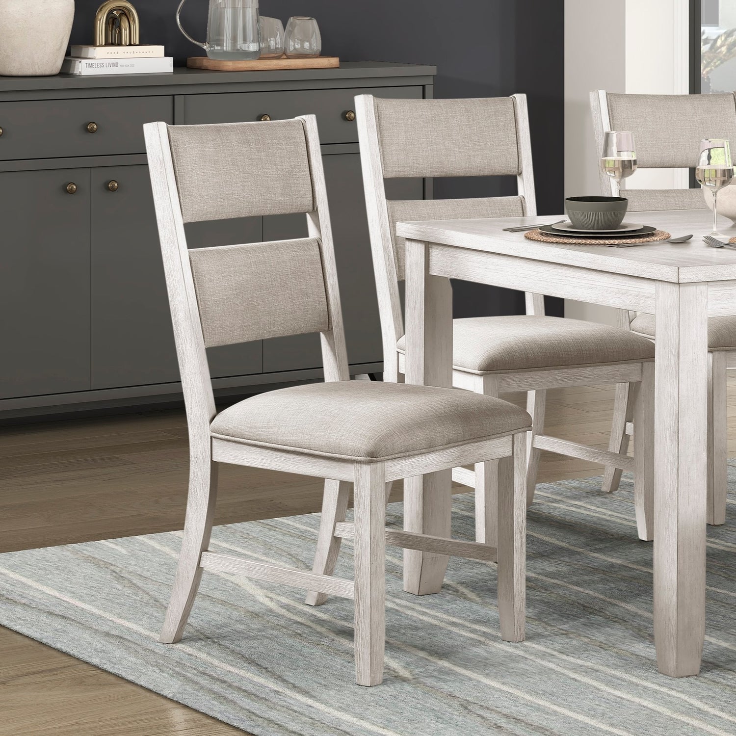 Modern Farmhouse 6pc Dining Set Table Bench 4x Side Chairs Upholstered Seat Antique White Finish Durable Wooden Furniture is available