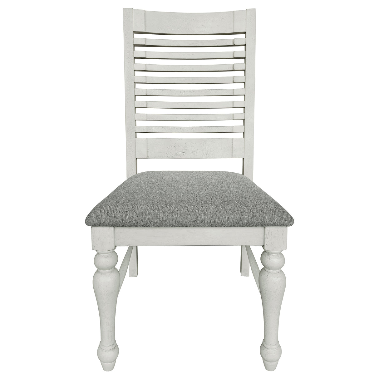 - Chairs feature tight ladder backs with a plush padded seat, gray fabric upholstery, and turned legs