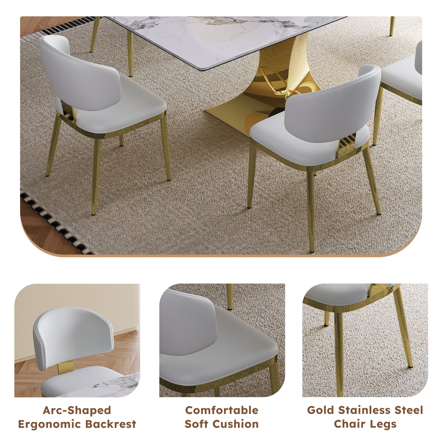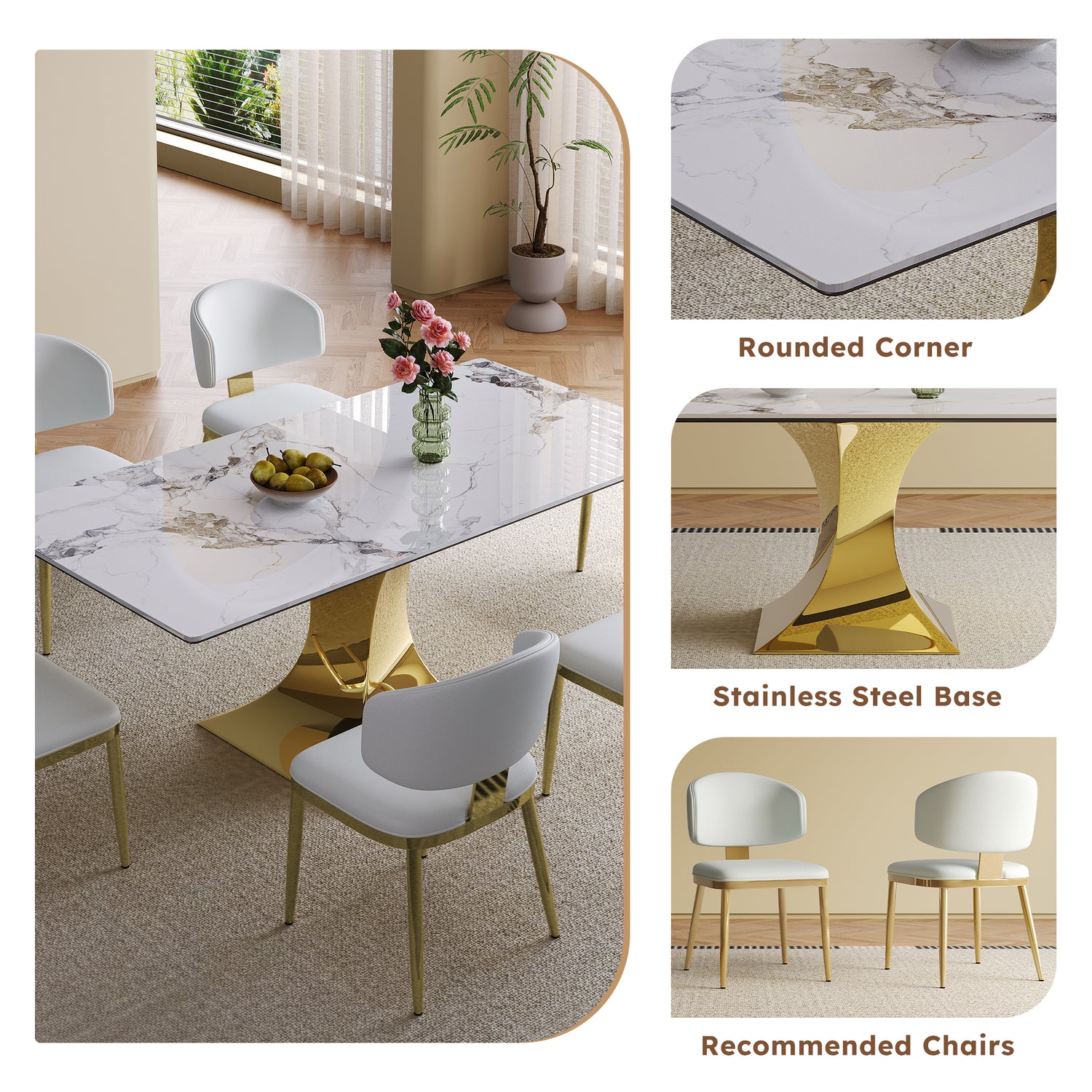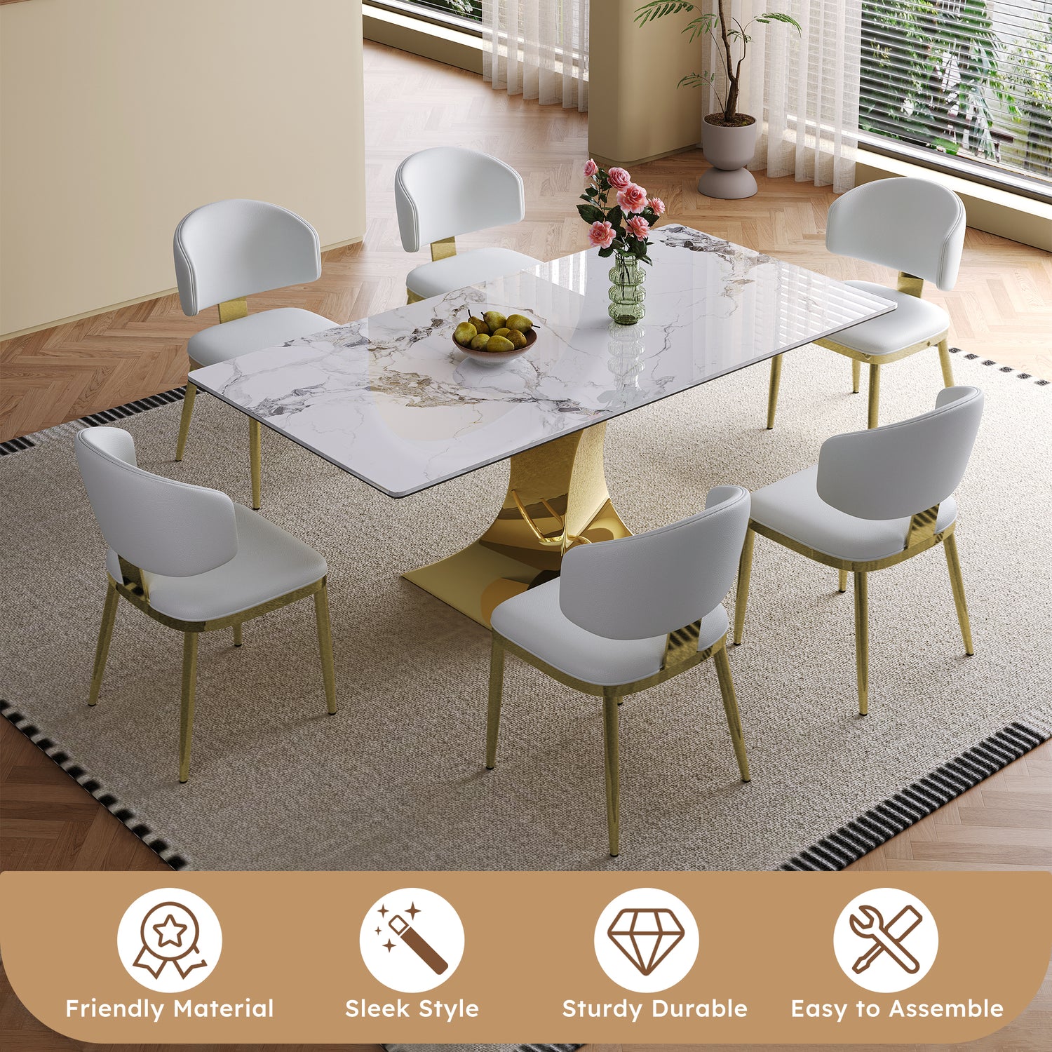 - Safe edge treatment: The dining table surface is a smooth white rock slab with a thickness of 12mm, and the edge of the table top is treated with humanized smooth treatment to prevent collisions and make your family and pets feel more at ease at home.
