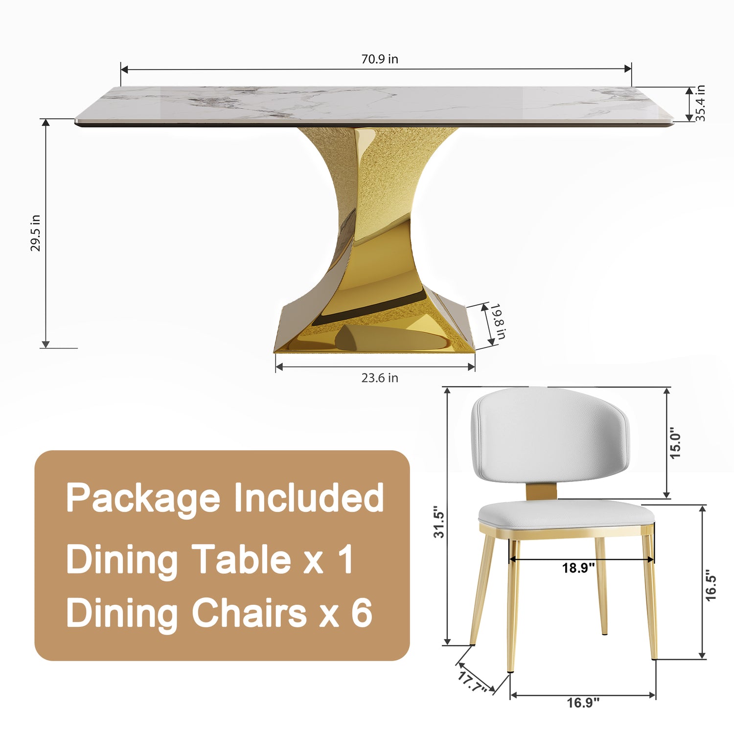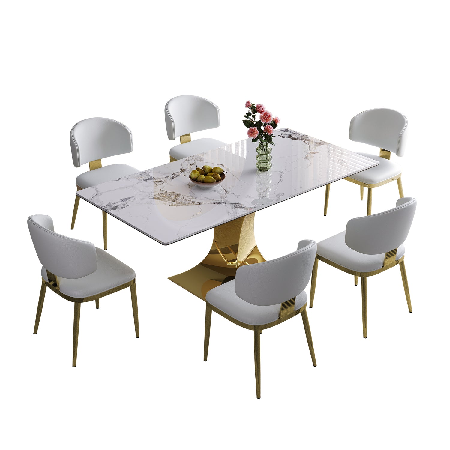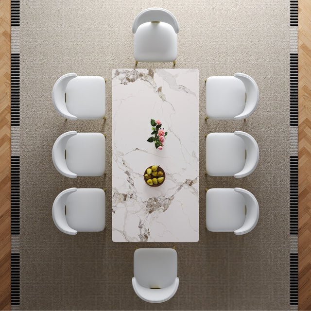 71' Rectangular Dining Table for 6-8, Modern Kitchen Table with Stylish Gold-Plated Hourglass Base, Large Dining Room Table (White+Gold) with 8 White Leather Chairs is available