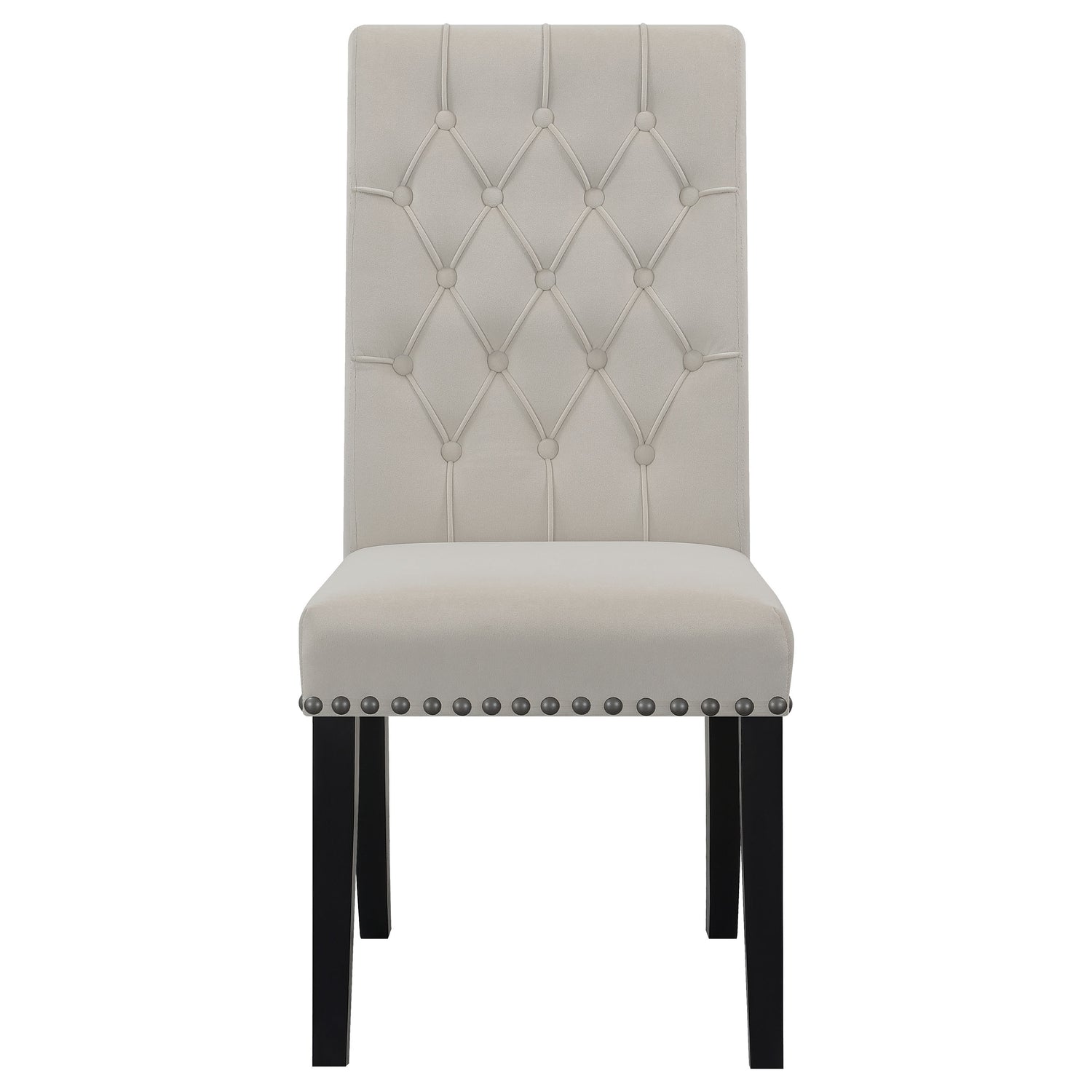 • Plushly padded side chairs showcase rolled backs, button-tufted upholstery, and bold nailhead trim for sophisticated comfort