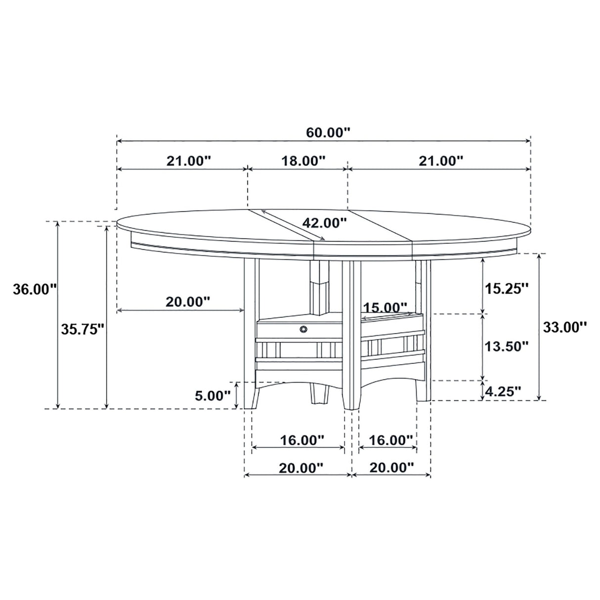 - Counter height table transforms from round to oval with 18" extension leaf
