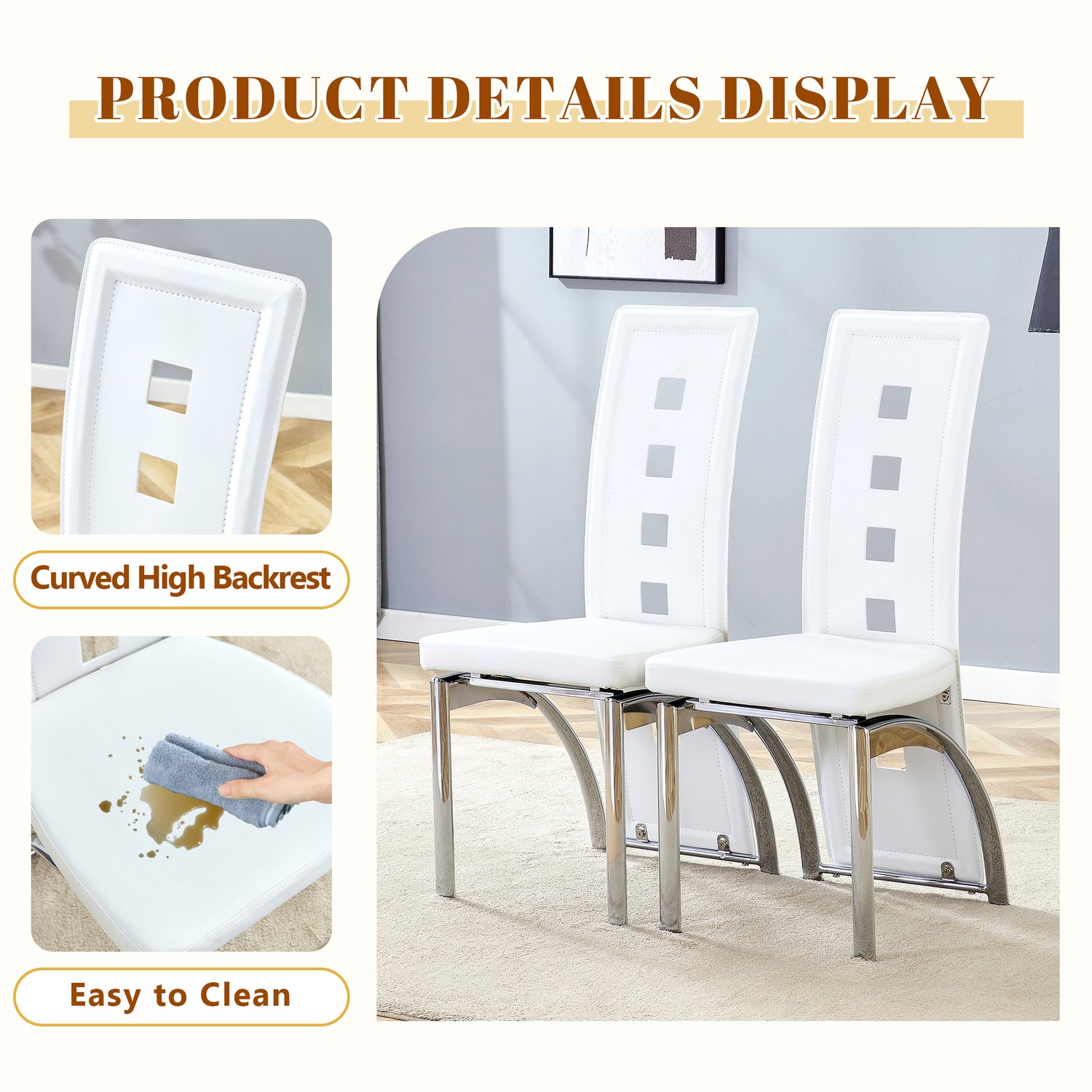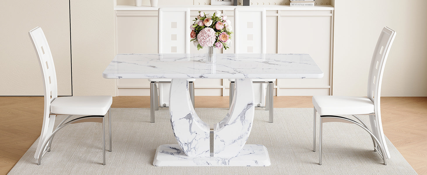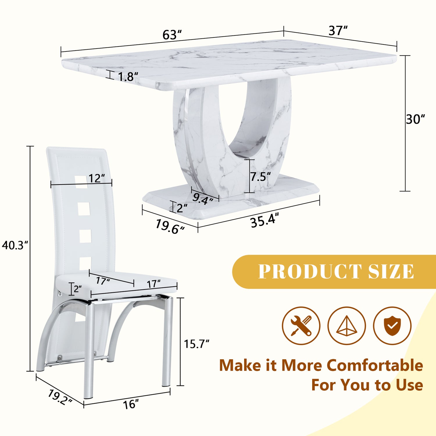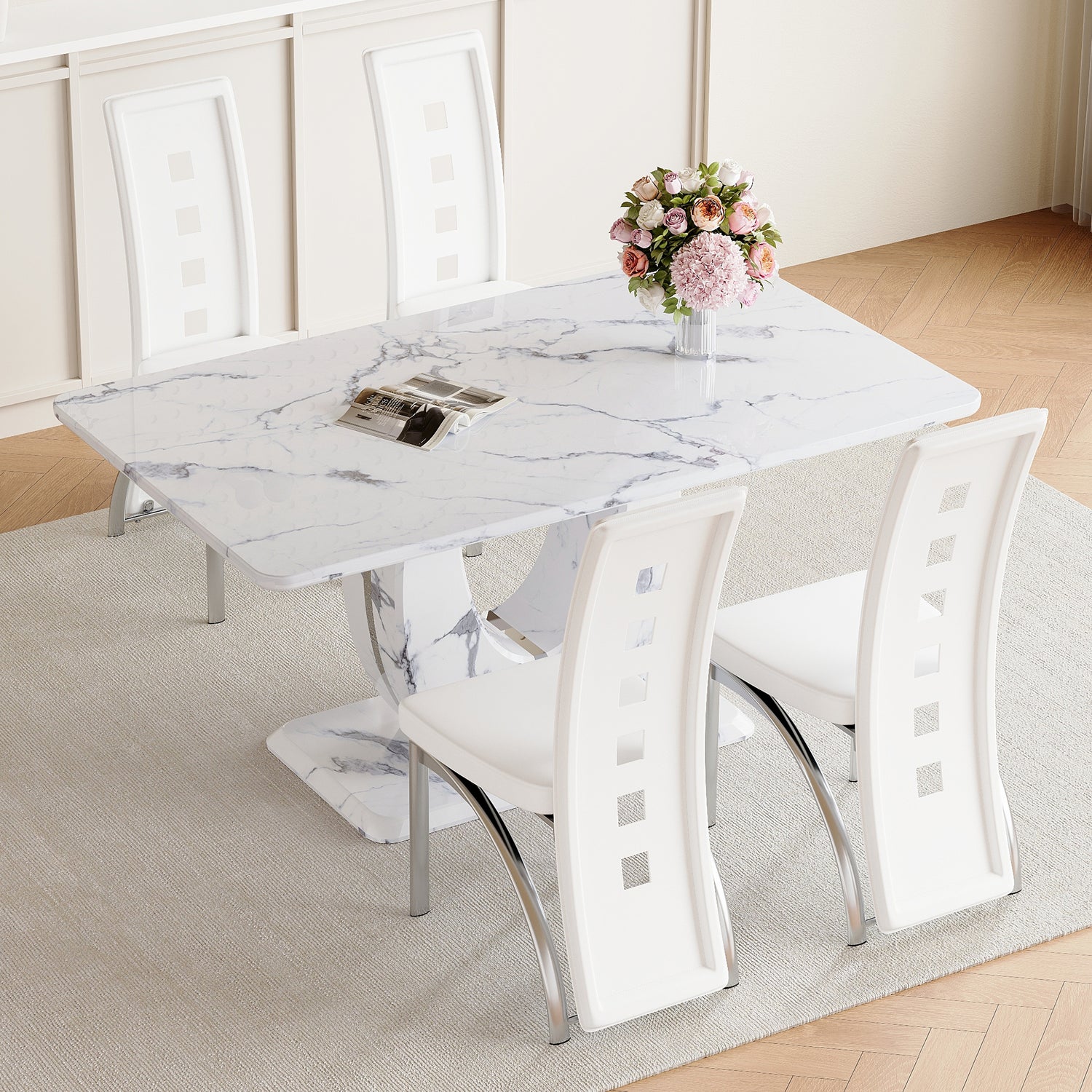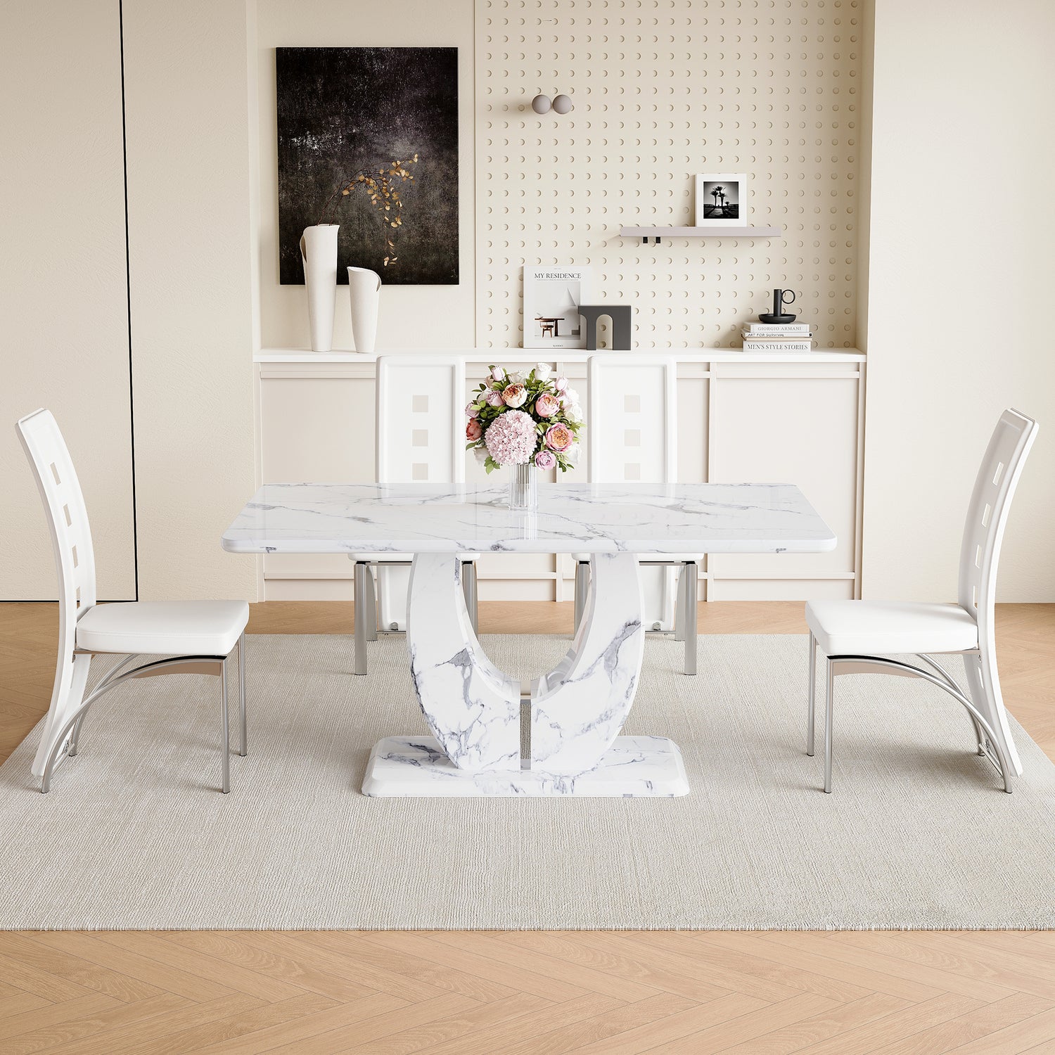 Table and chair set.Modern Luxury Grayish White Marble Patterned Dining Table Set - 63'x37' with 4 PU Chair With White Saddleback, Geometric Pattern Backrest,Silver Curved Metal Leg.