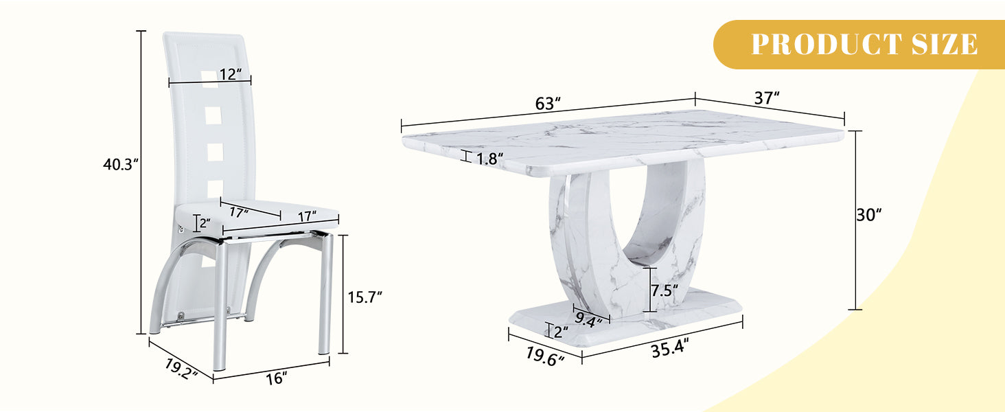 Table and chair set.Modern Luxury Grayish White Marble Patterned Dining Table Set - 63'x37' with 4 PU Chair With White Saddleback, Geometric Pattern Backrest,Silver Curved Metal Leg. is available