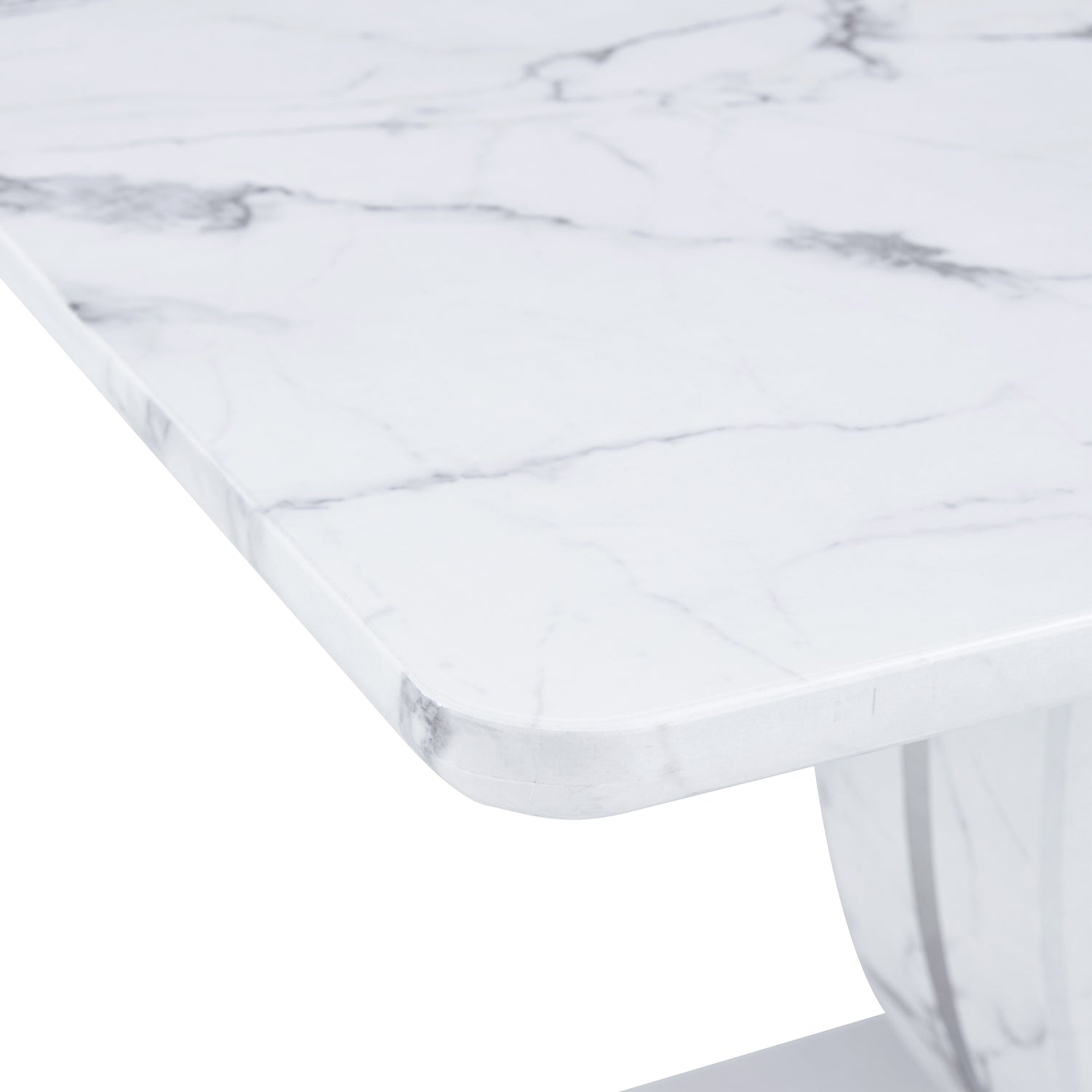 - Unified Marble Pattern Design: The dining table is made of MDF material with grayish white marble pattern stickers, showcasing a harmonious and understated luxury.