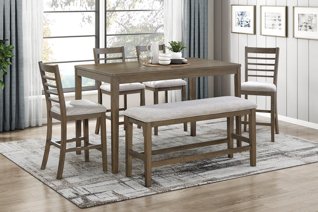 Elevate your dining experience with the light brown six-piece counter height dining set. This stylish set includes a counter-height rectangular table, four matching counter-height chairs, and a coordinating bench, providing comfortable seating for up to six people. Crafted with durable oak veneer, wood, and engineered wood in a warm light brown finish, this set offers both contemporary style and lasting quality. Each chair and the bench feature a fabric-upholstered seat cushion, ensuring a comfortable perch for casual meals and gatherings. Perfect for smaller spaces or creating a more relaxed dining atmosphere, this counter height set is a versatile and inviting addition to any home. PRODUCT DIMENSIONS: TABLE: 35' x 58' x 36.5'H CHAIR: 17.5' x 20.5' x 40.5'H, Seat Height: 25' BENCH: 48' x 16' x 25'H Listing Includes: 6pc Dining Set (1 Counter Height Table, 4 Counter Height Chairs and 1 Counter Height Bench) Only. Assembly Required.