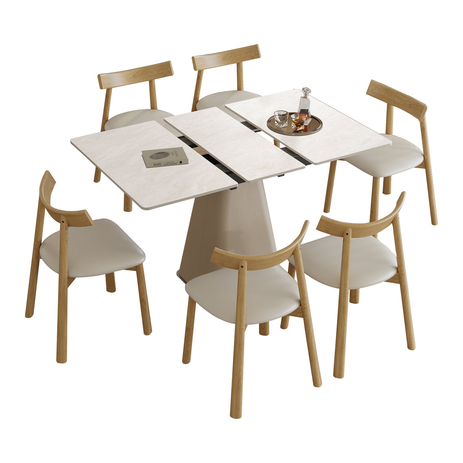 Retractable Rock Slab Dining Table Set, Modern 7-Piece Expandable Table with 6 Wooden Leg Chairs & Leather-Wrapped Base, Space Saving Kitchen Set for Small Apartments