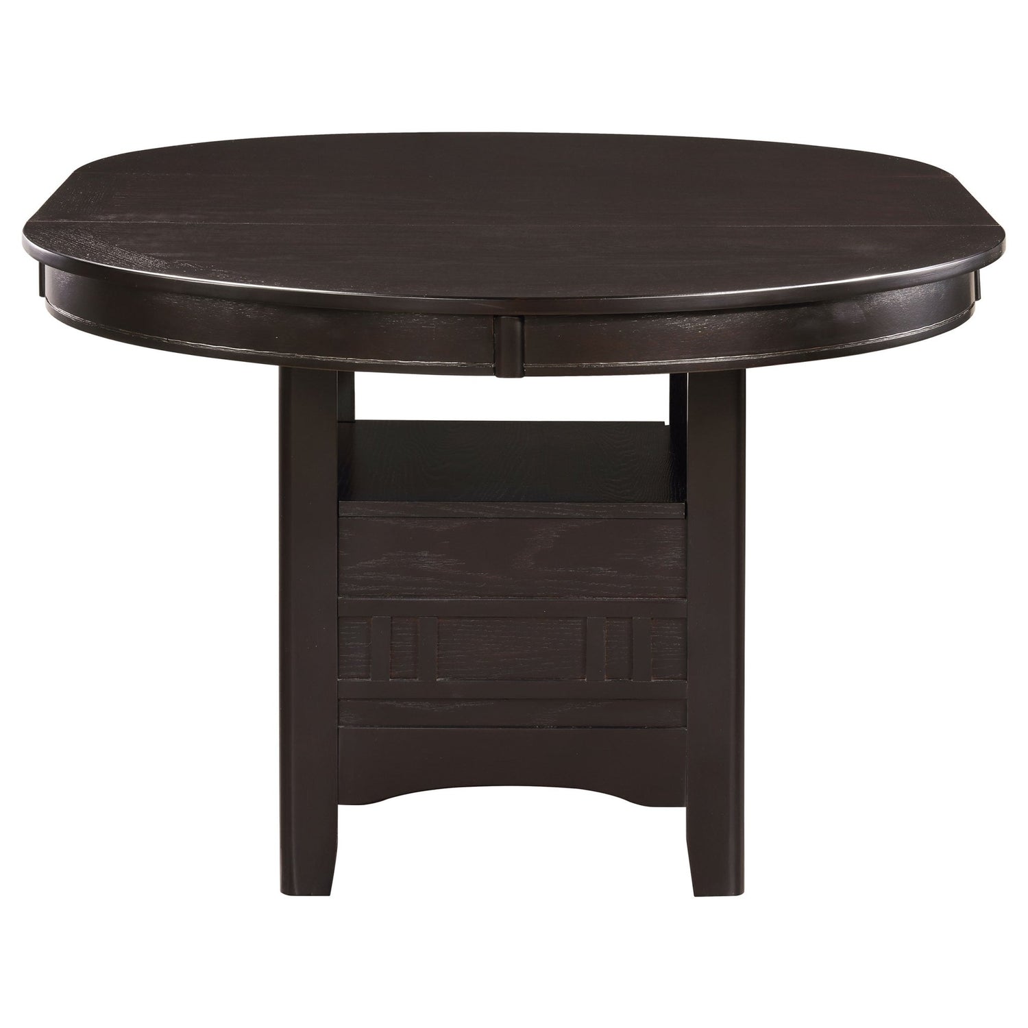 From the Lavon Collection, a transitional dining table that's both eclectic and versatile. Oval shape for intimate gatherings with 18" extension leaf. Warm espresso finish is inviting and matches your cozy home decor. Table base has closed storage unit and top shelf to keep the table top uncluttered and meal-focused. Matching chairs feature black leatherette cushions.