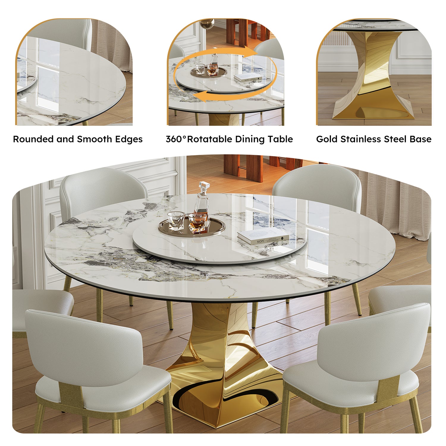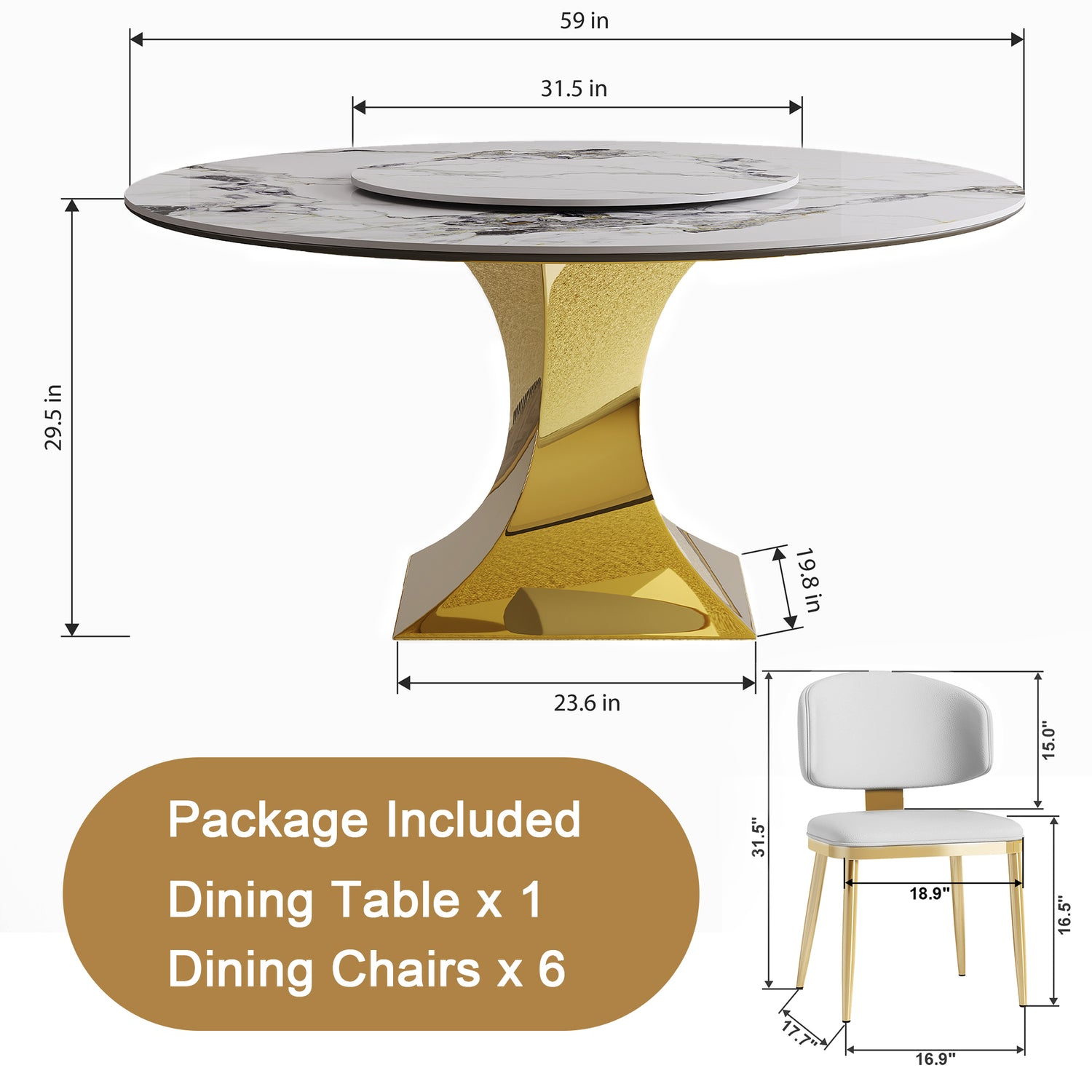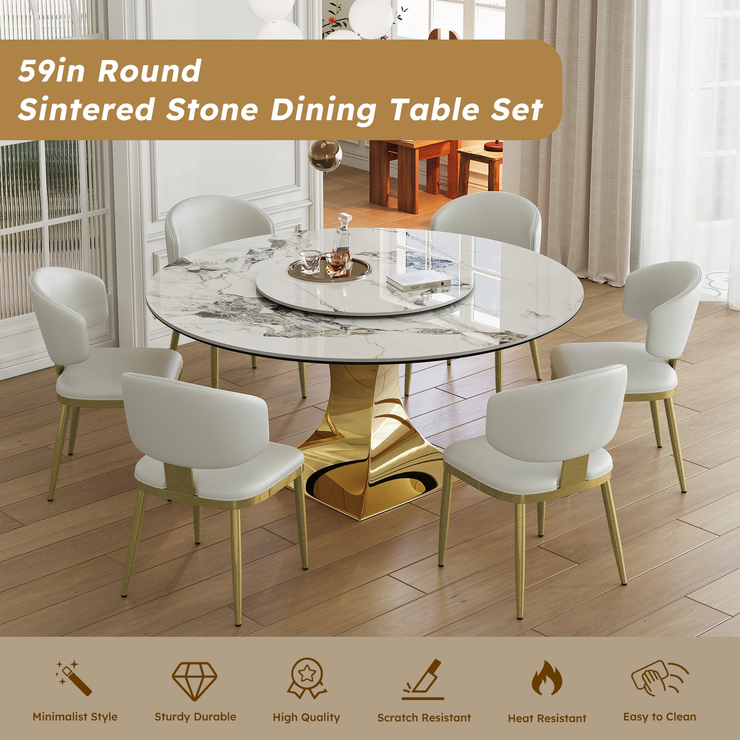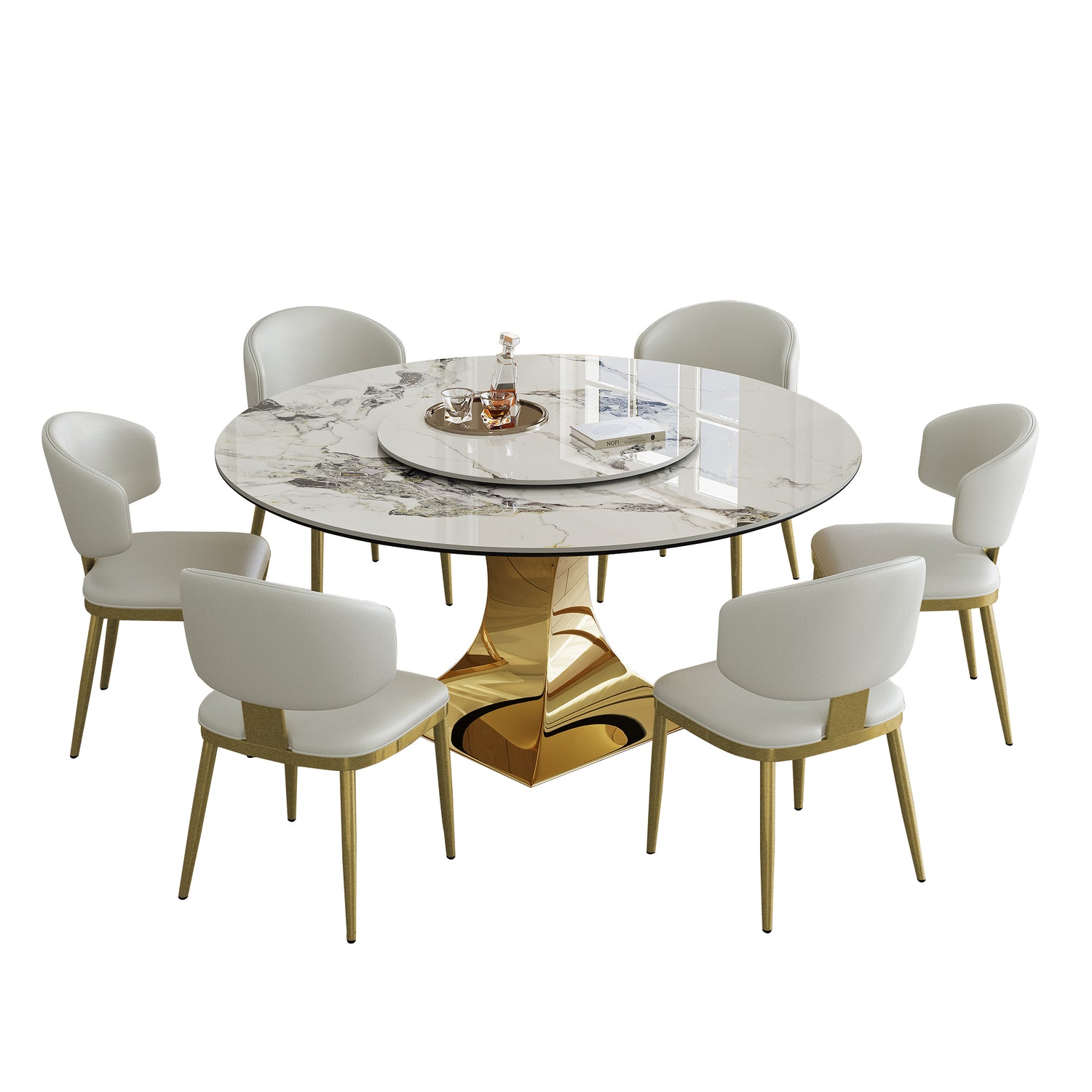 - Round Sintered Stone Dining Table Set - Modern Gold-Plated Hourglass Base with 6 Upholstered Chairs, Scratch-Resistant Surface for 4-6 People