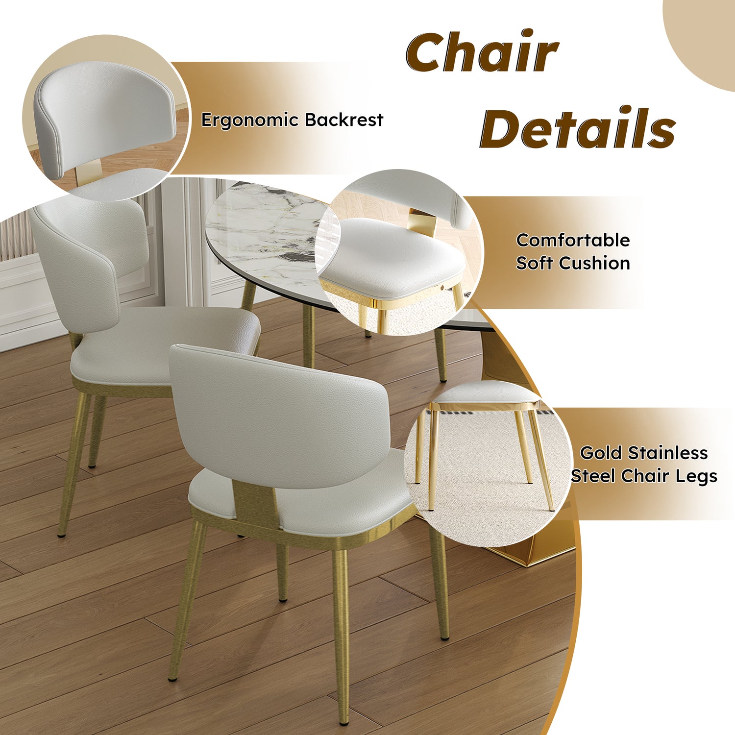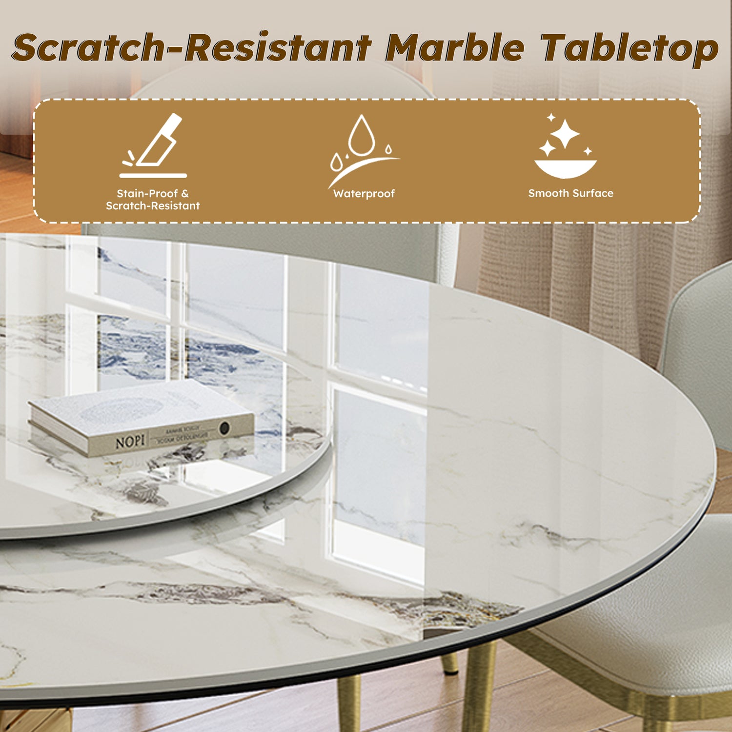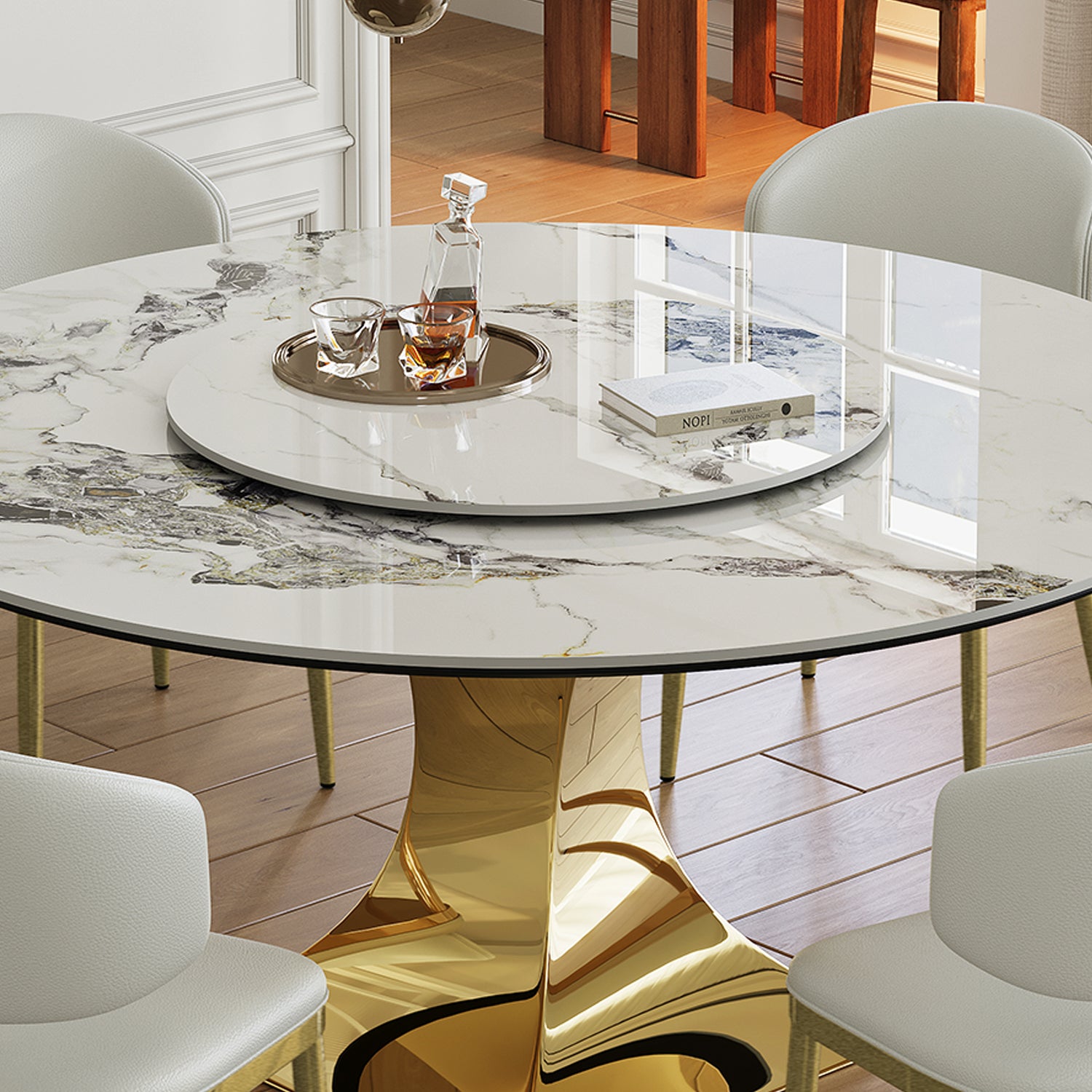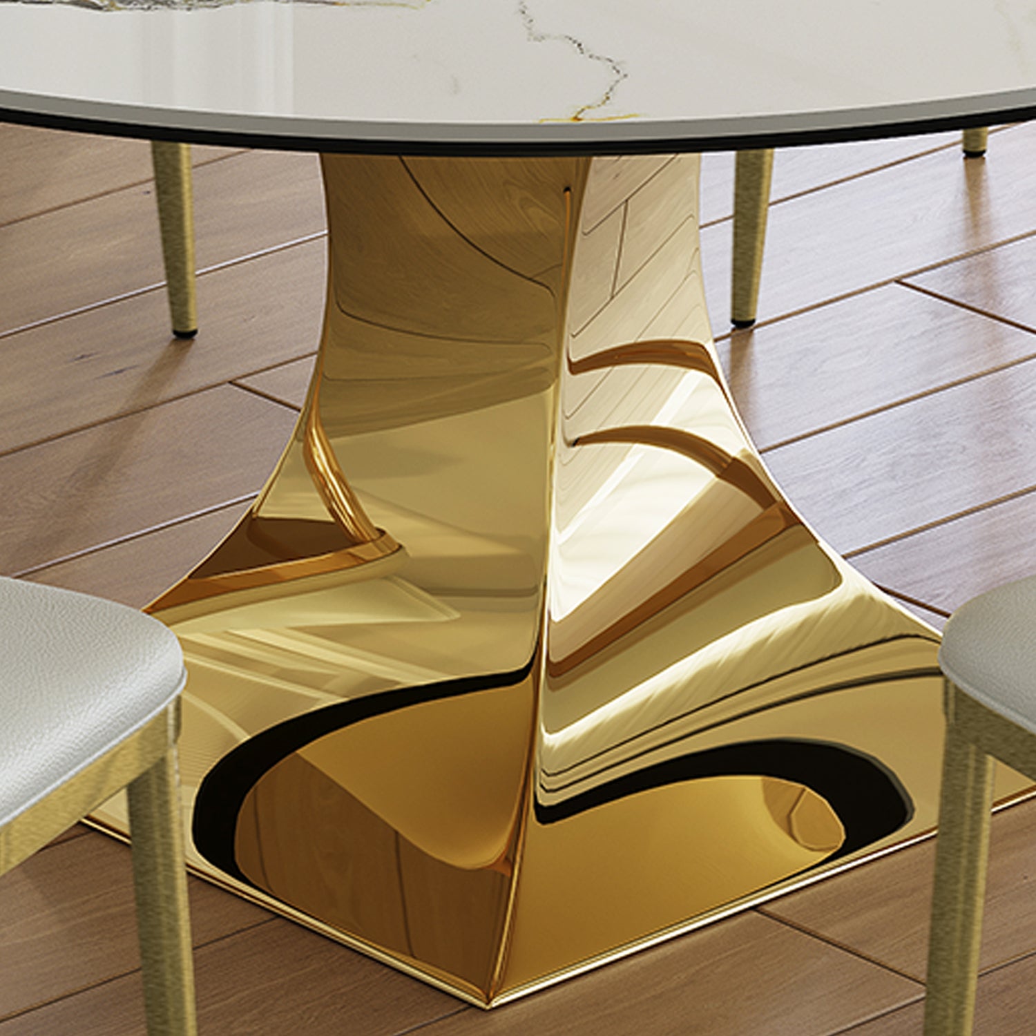 - Round Sintered Stone Dining Table Set - Modern Gold-Plated Hourglass Base with 6 Upholstered Chairs, Scratch-Resistant Surface for 4-6 People
