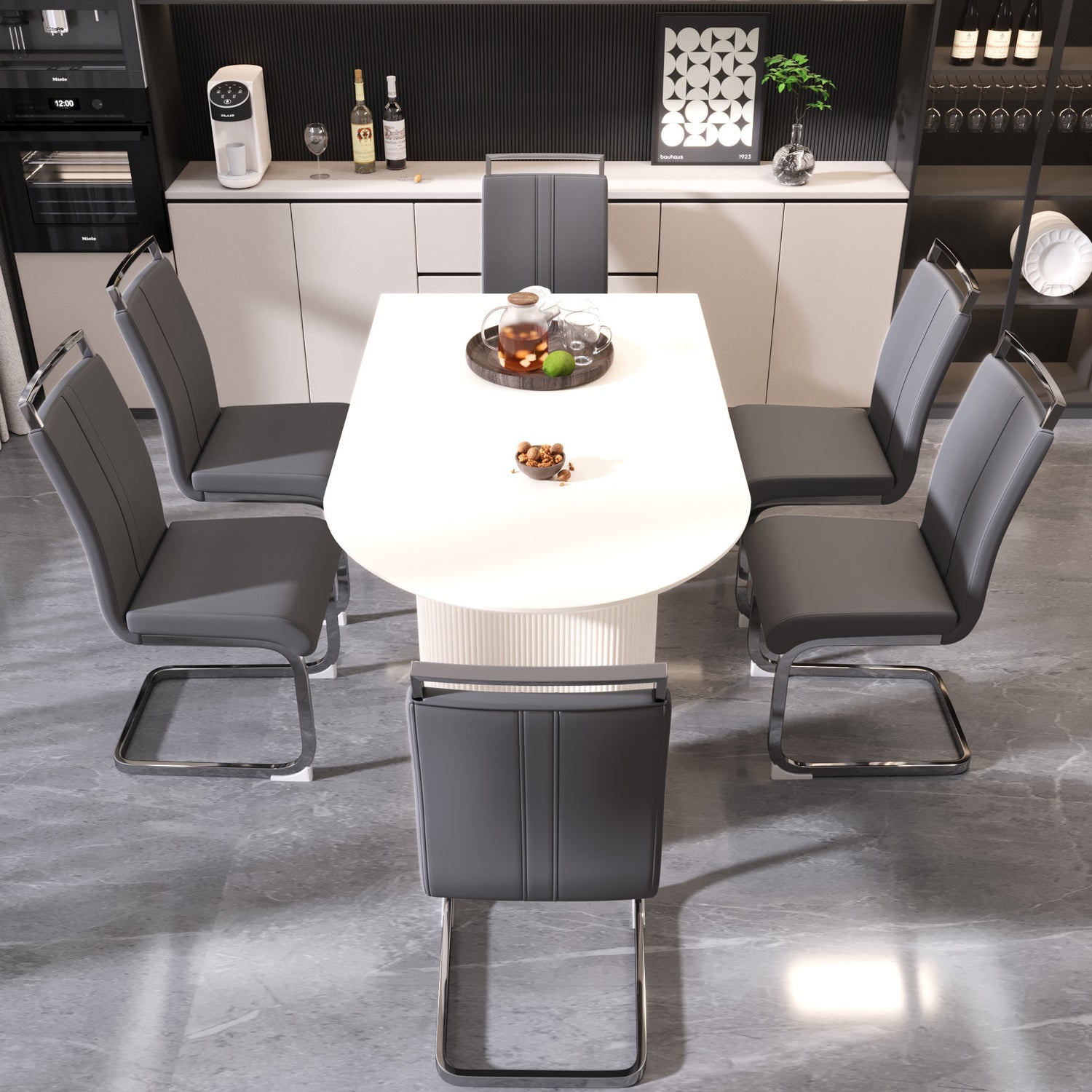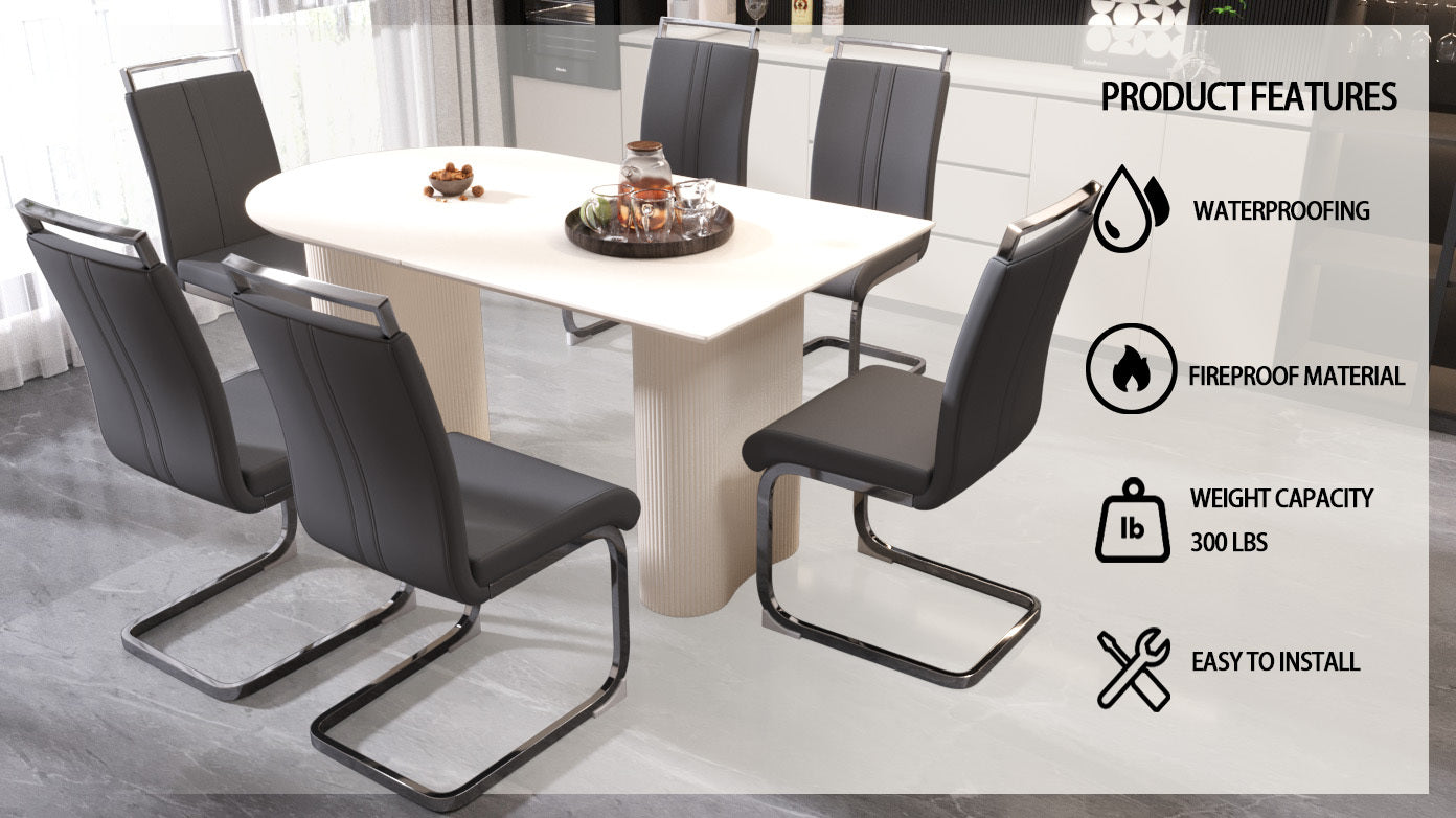 - 2.7-piece dining table and chair set: A table that can accommodate 4-8 guests for gatherings and six ergonomically designed leather modern style armless dining chairs, creating a fashionable focus for you in the dining area.
