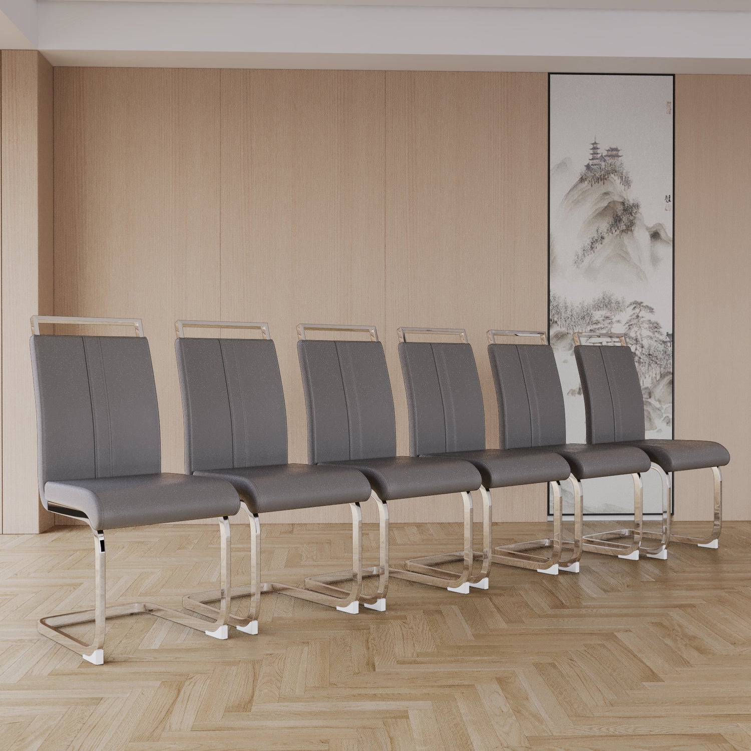 - 8.Durable and sturdy: The sturdy gray leather dining chair is equipped with a C-shaped silver plated base, creating a unique modern appearance. The bottom has scratch resistant plastic feet to prevent damage to the floor.