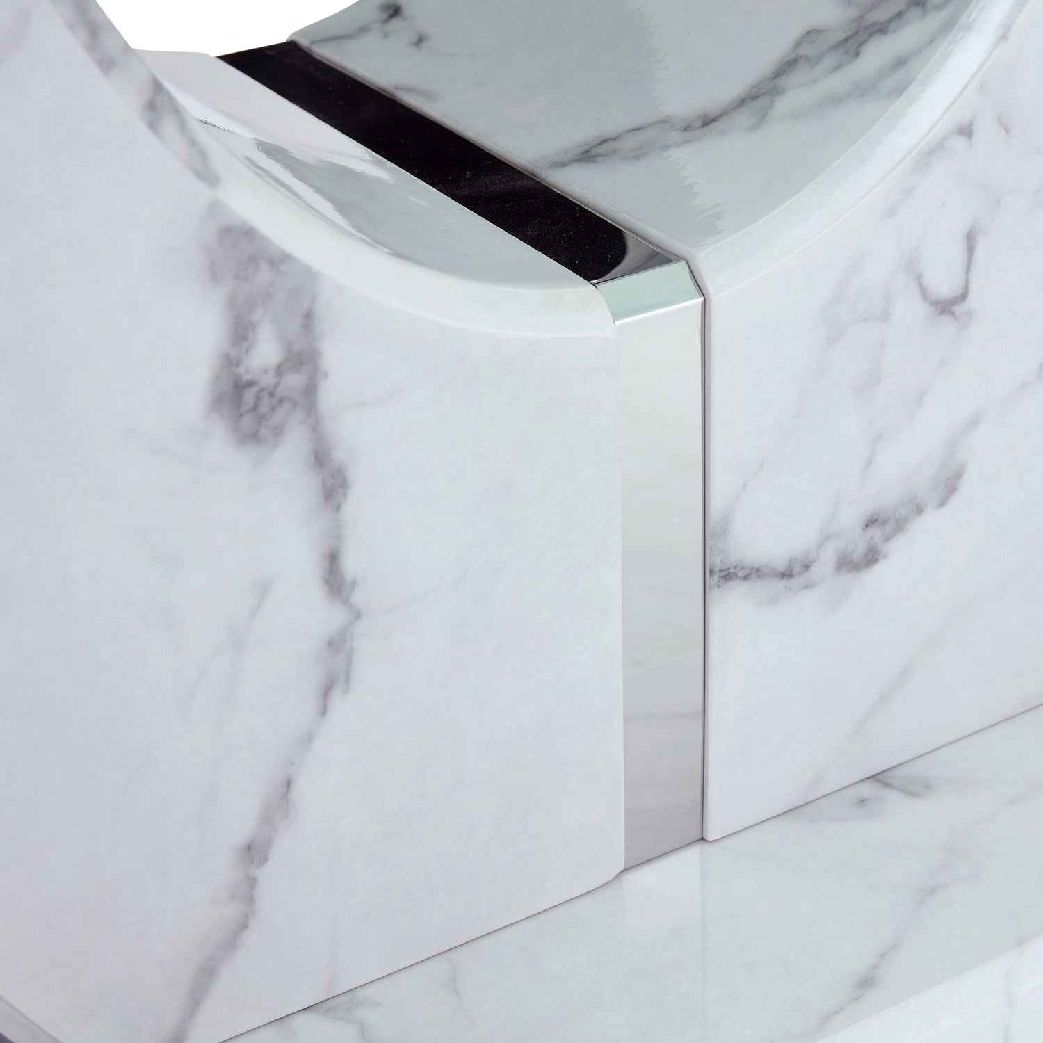 - Elegant Marble Pattern: The tabletop is adorned with a white marble pattern sticker, bestowing the dining set with a noble and elegant aura.Silver Stainless Steel Accents: U-shaped legs are complemented by silver stainless steel decorative strips, adding a touch of modern luxury.