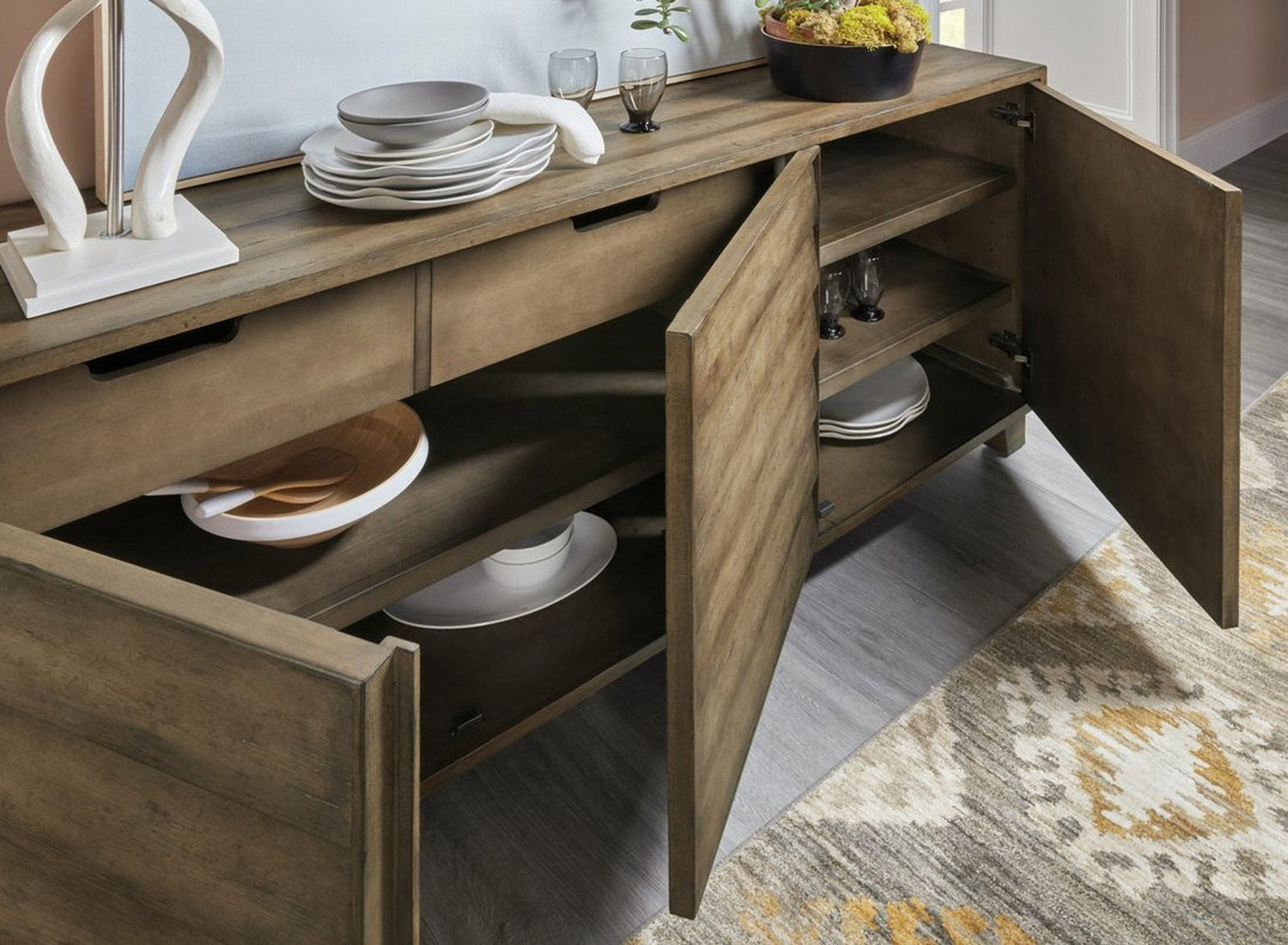Crafted with Quartered Pine and Maple Veneers and a solid-wood edge top, the buffet is finished in Cliffside—a dynamic dark brown with light burnishing and distressed character. Behind its three soft-close doors are two self-closing drawers, a felt-lined silverware tray, and three adjustable shelves for flexible storage of tableware, serveware, or media accessories.