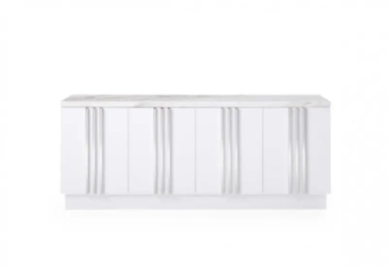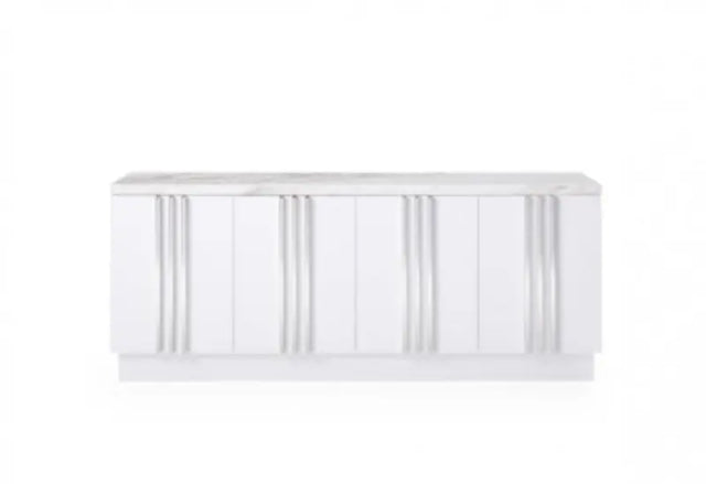 A showcase of style and function, the Modrest Kingsley Modern Marble & Stainless-Steel Buffet puts clutter away in your dining room. Matching the exquisite rectangular white marble top is the satiny white high gloss finish body that makes up this remarkable buffet. Vertical stainless-steel accents enhance its overall appeal. This buffet features four cabinets with doors; the middle cabinets feature two easy-to-open drawers, while the right and left cabinets feature two shelves. Requiring assembly, this well-designed modern buffet allows you to store items in an organized manner and offers a large surface to display decor and mementos.