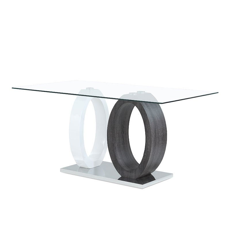 The D1628 clear glass top contemporary dining table by Global Furniture featuring opposite oval design and stainless steel base. One oval pedestal is white high gloss laminate and one is a grey wood laminate.