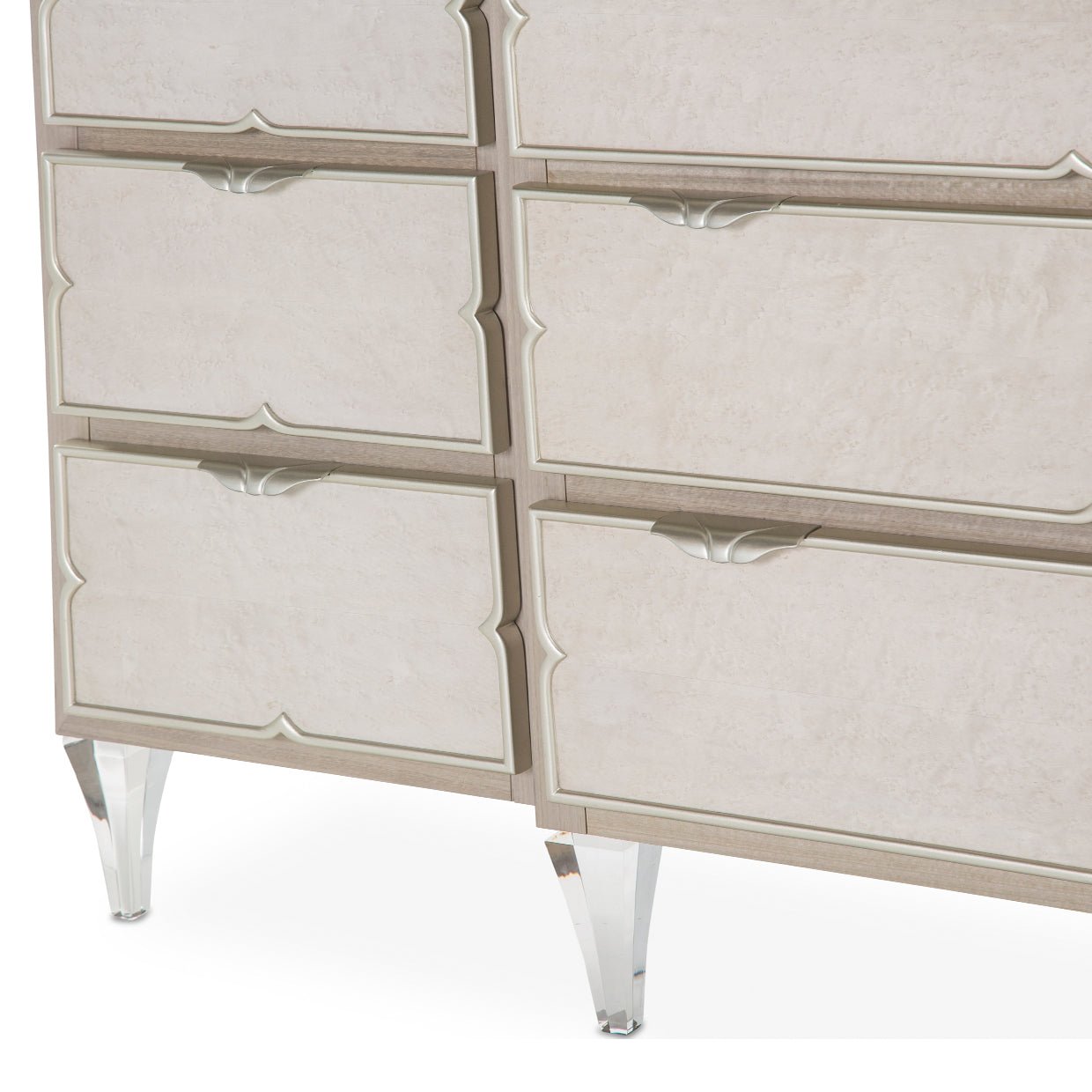 - Platinum-finished hardware, scalloped pulls, and acrylic feet enhance glam appeal