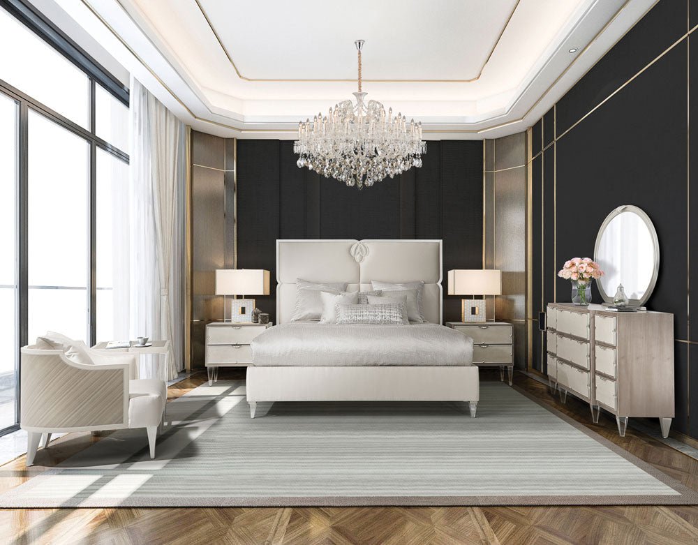 The Camden Court Dresser & Oval Mirror by AICO redefines bedroom sophistication with high-end materials and graceful design. Showcasing a luxurious Pearl finish accented by platinum trim, this set balances contemporary lines with romantic curves. Its sculptural mirror, marble top, and velvet-lined drawers make it as functional as it is elegant.