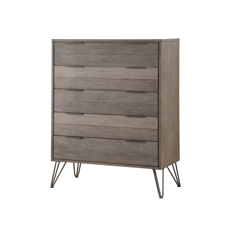 Perched atop metal legs, creating a dramatic statement of contemporary styling, the Urbanite Collection is a perfect reflection of your modern style preference. The solid acacia wood with acacia veneer is highlighted by a 3-tone gray finish that allows the variance of the natural grain to shine. The horizontal slat design as well as metal pull tab hardware lend to the clean, contemporary look of the collection.