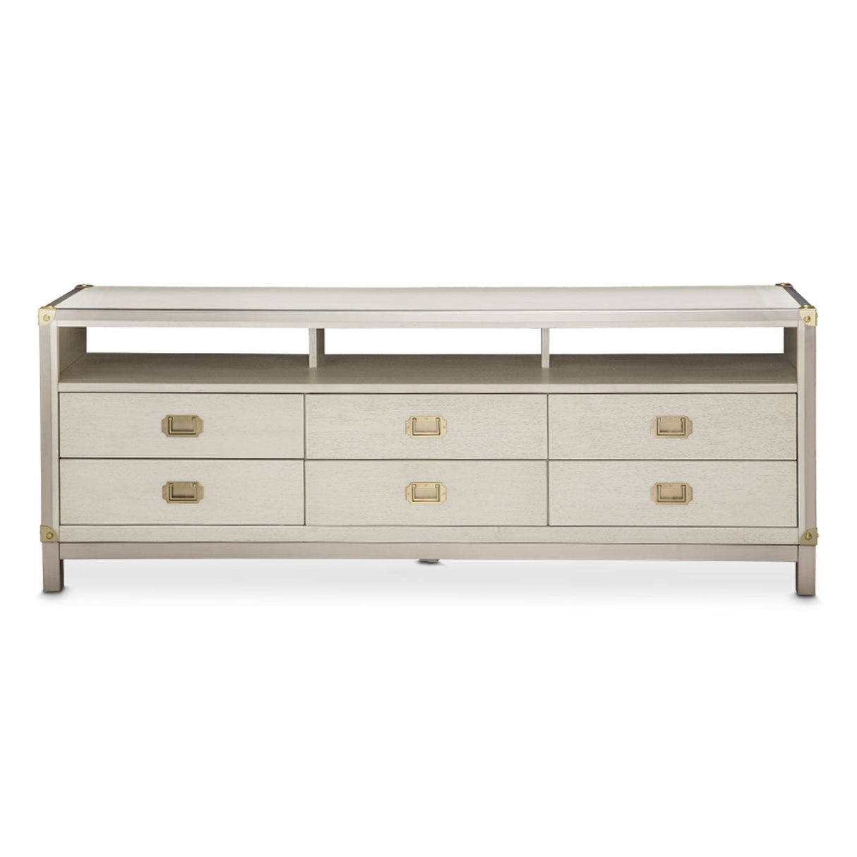 The Menlo Station TV Console by AICO brings elevated functionality to your living space with a light, relaxed aesthetic. Constructed with durable Hevea wood solids and wrapped in Acacia veneer finished in a soft Eucalyptus tone, this piece showcases a refined balance of texture and tone. The campaign-inspired bronze metal hardware and nailhead accents contrast beautifully against brushed silver metal framing, creating a look that’s clean, casual, and designer-inspired. With six velvet-lined drawers and three wide media shelves, this console offers stylish storage with everyday usability.