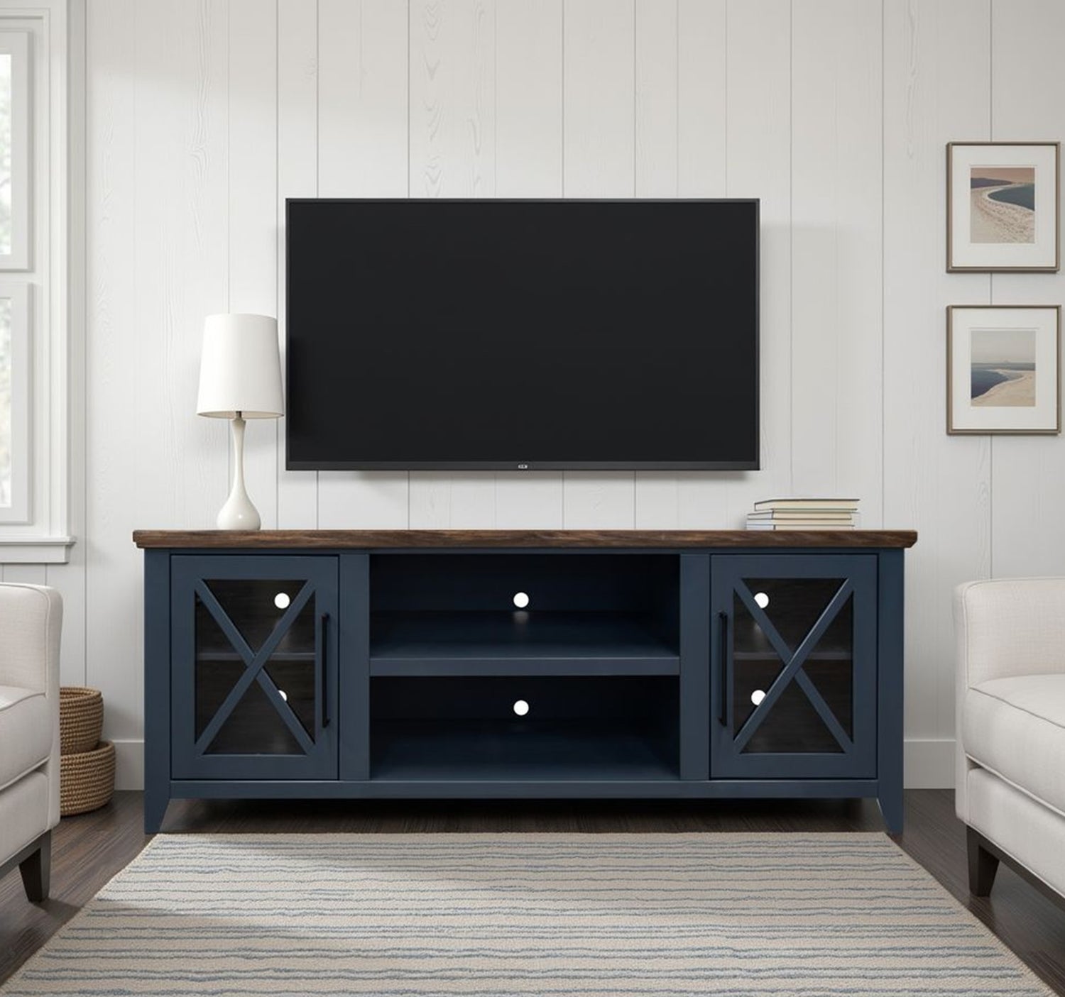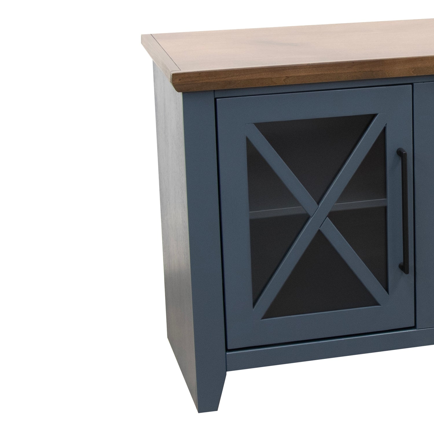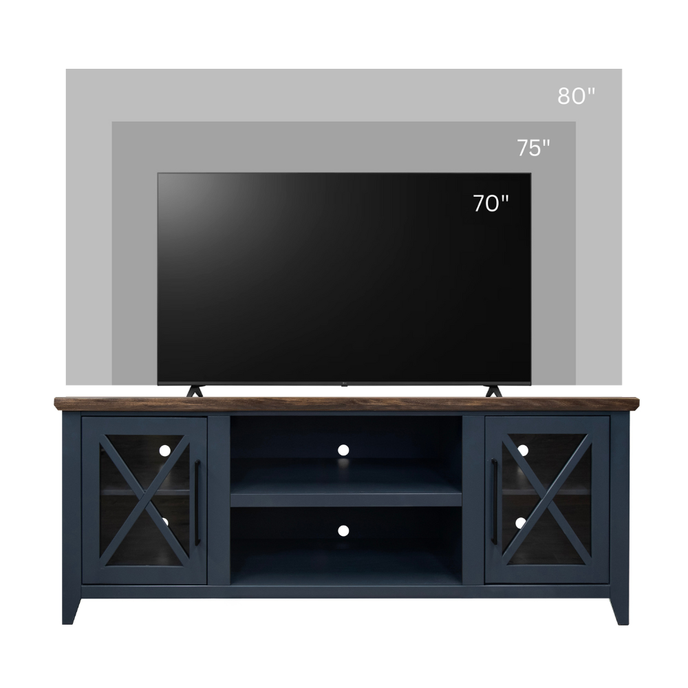 Ithaca 66 inch TV Stand Console, For TVs up to 80 inches, No Assembly Required, Blue and Bourbon Finish