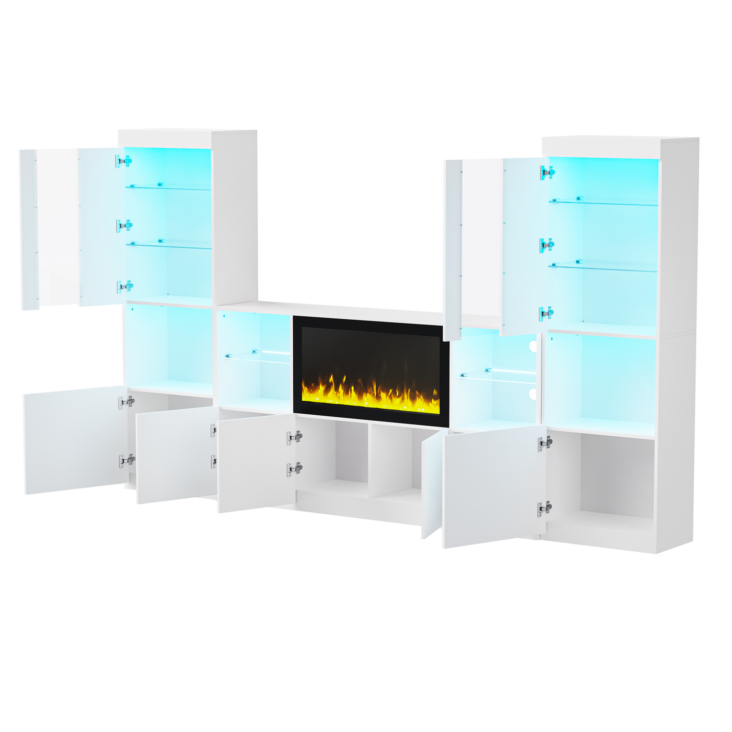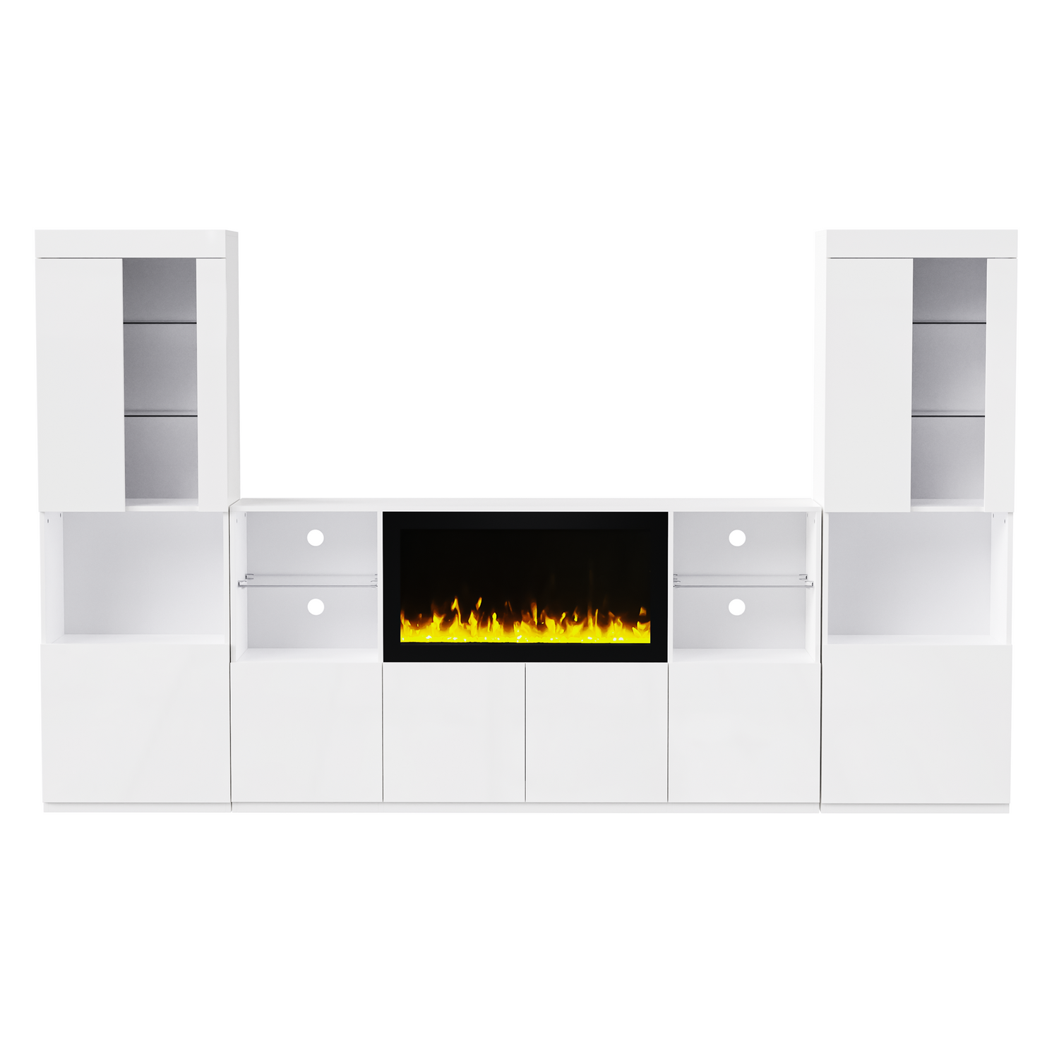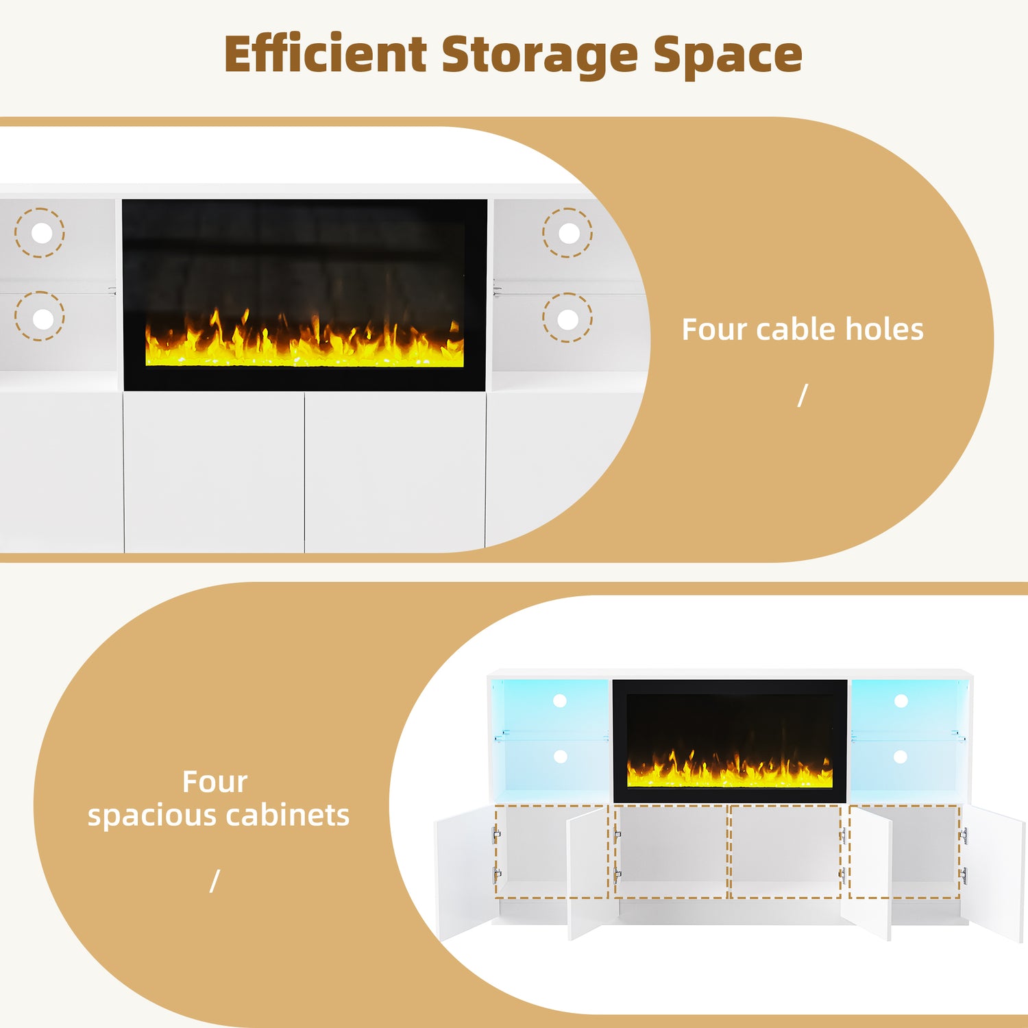 ON-TREND Modern TV Stand with 34.2' Non-heating Electric Fireplace, High Gloss Entertainment Center with LED Lights, Media Console with Tempered Glass Shelves for TVs up to 75', White is available
