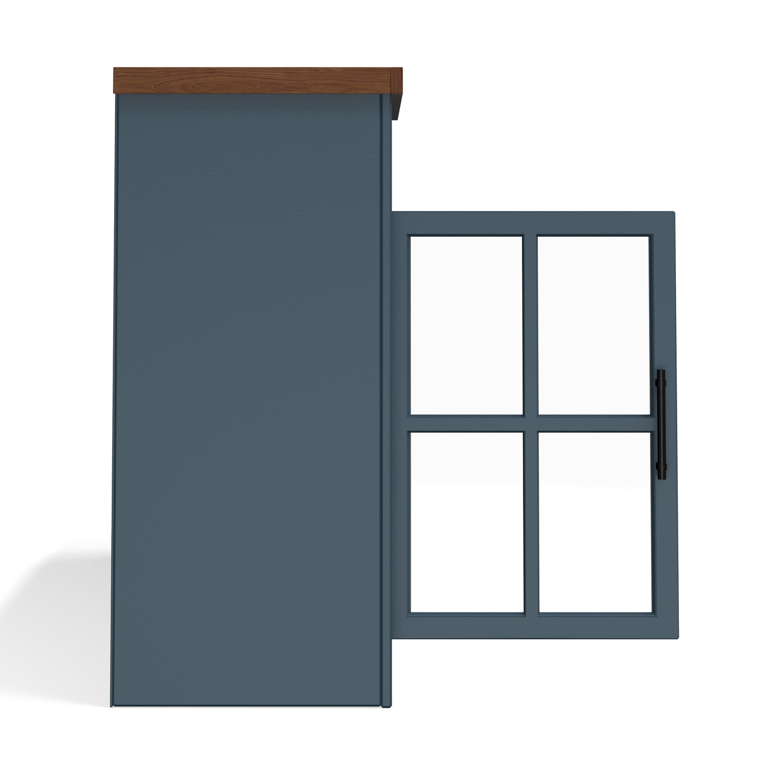 - Two glass window pane doors, Two fixed shelves 18” wide x 17”deep x 12-1/2” high, Three open shelves 22” wide x 17” deep x 5” high