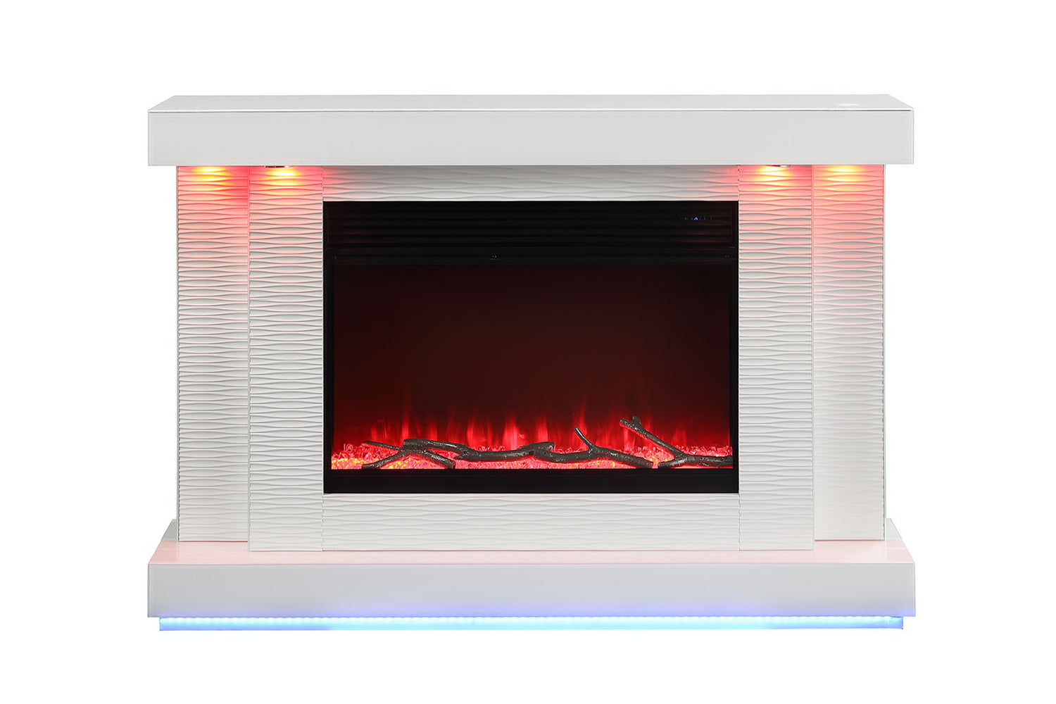 Contemporary — the design is relatively clean and modern, with minimal ornamentation. White, giving it a light, neutral appearance that can blend with many interior palettes. It is built with a mix of pinewood, engineered wood, glass, and metal components. Integrated electric fireplace in the center, with flame / brightness settings and likely heating capability. Media storage and open shelving around or adjacent to the fireplace, to house devices and allow ventilation and cable access.