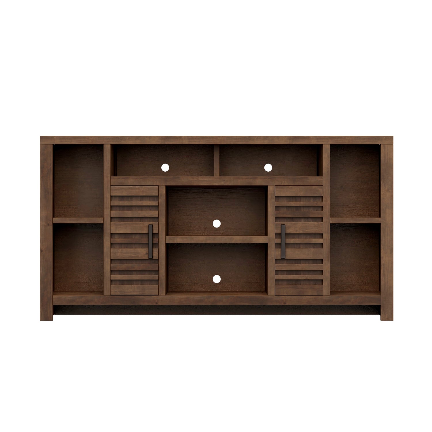 This 64 inch TV Stand Console delivers a modern robust silhouette with a slightly rustic and urban feel. Skillfully crafted from Knotty Alder Solids and Veneers, this entertainment center boasts intentional distressing and a rich Whiskey finish that enhances the natural wood grain. Featuring six shelves and two doors with horizontal slat detailing and Flat Black hardware, this TV Console will accommodate TVs up to 70 inches and provide ample storage for media and gaming consoles and home décor favorites. Cable management openings on the back panel will keep your cords and wires concealed. Fully assembled upon arrival, this piece is ready to unbox and enjoy.