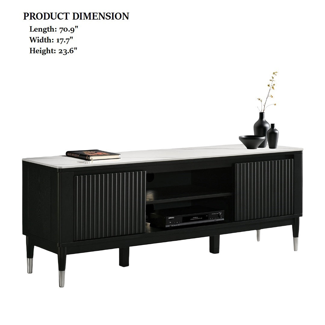 Contemporary Style TV Console Sintered Stone Top Silver Capped Arrow Legs Open Shelves Black And White Finish Primary Living Room is available